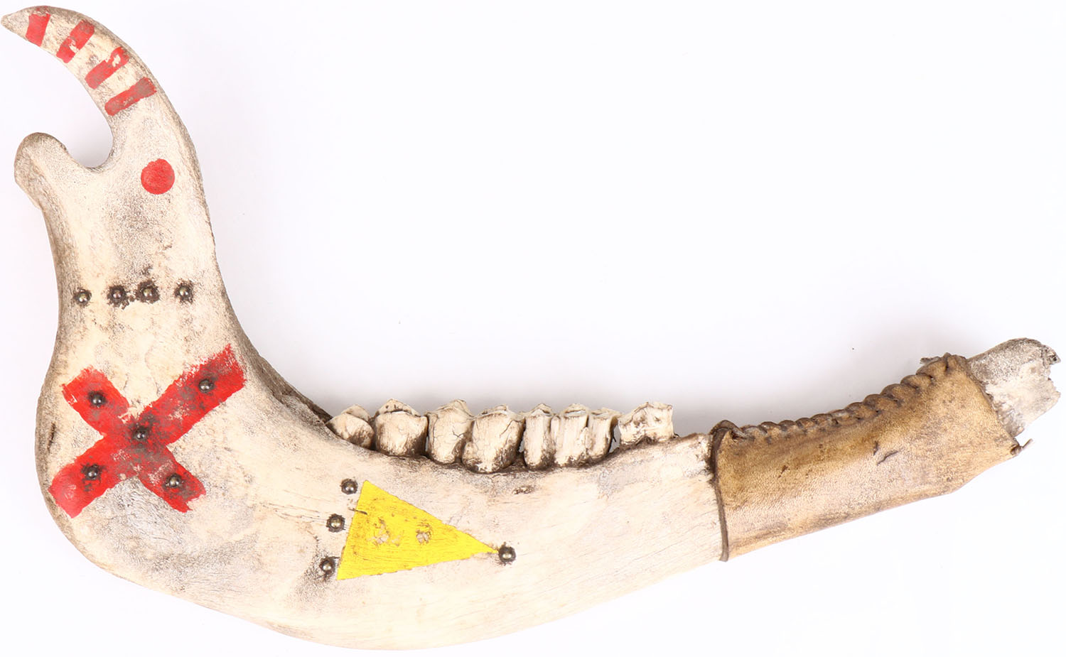 Buffalo Jaw Bone Plains Indian Club. Circa 1880. Paint designs, brass tacks, Buffalo hide and Sinew sewn. Nice weapon. Grade: Very Good - Value: 100 to 600