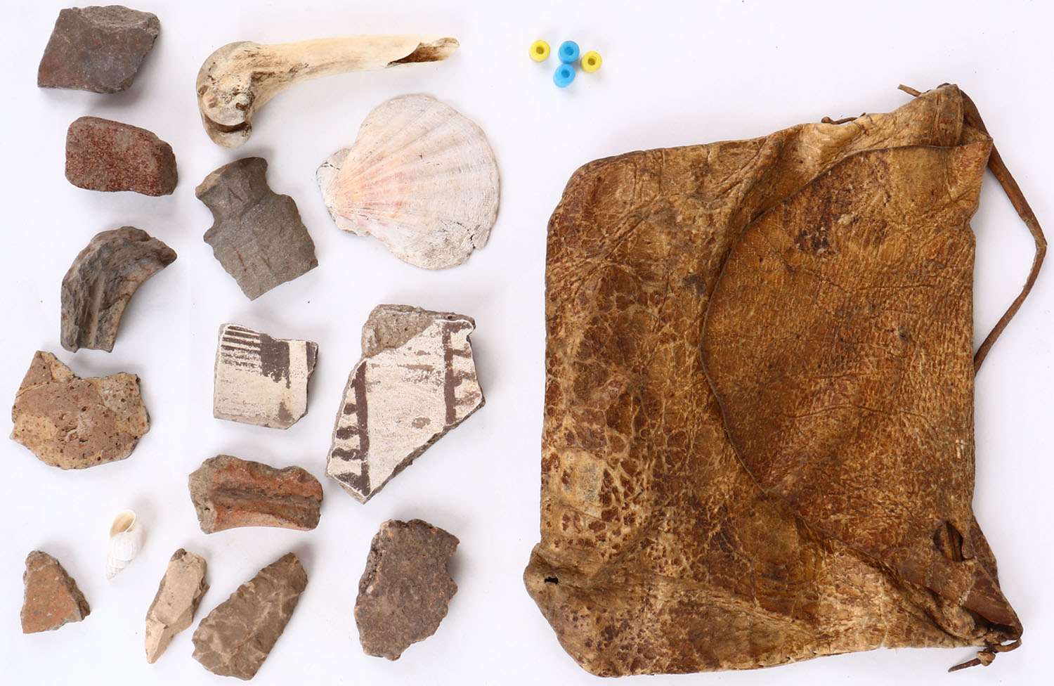 Extremely RARE mid 19th century Apache Medicine Man hide bundle. From the White Mountain Apache region in Eastern Arizona. Very old Bison Hide bag with contents of flint, shell, beads, pottery shards, and other materials for Spirit Medicine. Bag is sinew sewn. Grade: Very Good - Value: 200 to 1000
