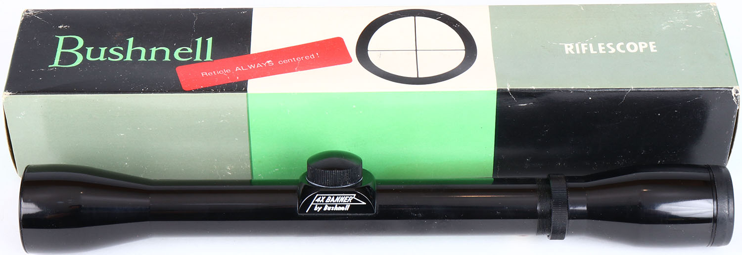 Bushnell Banner rifle scope 4x, #71-1402, in orignal box. Grade: Excellent - Value: 30 to 90