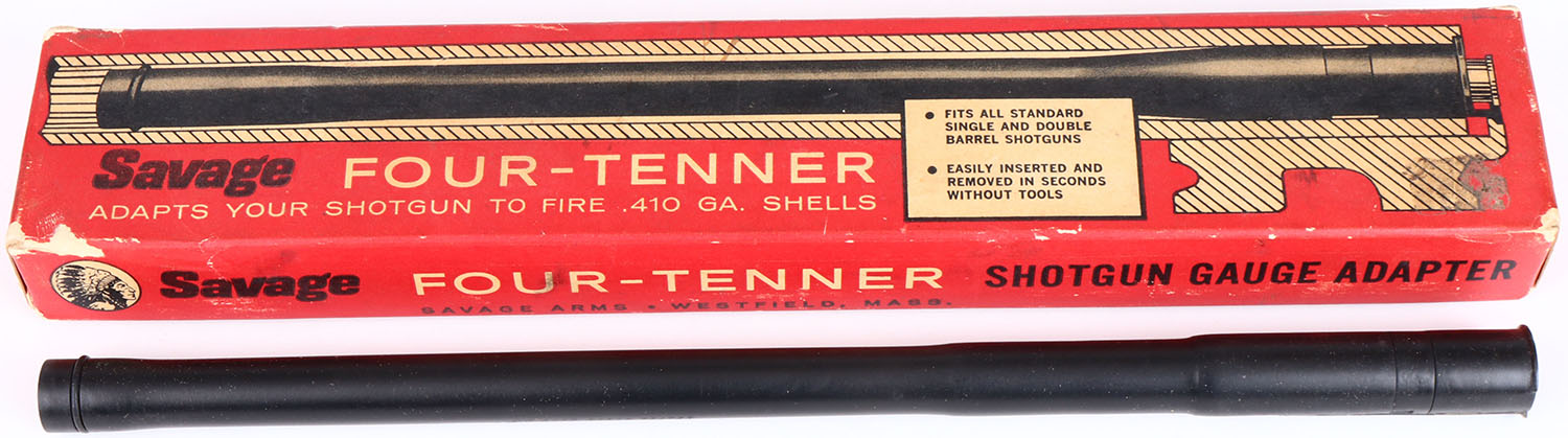 Savage Four-Tenner, 20 ga. In orignal box, box has age soiling. Grade: Excellent - Value: 80 to 300