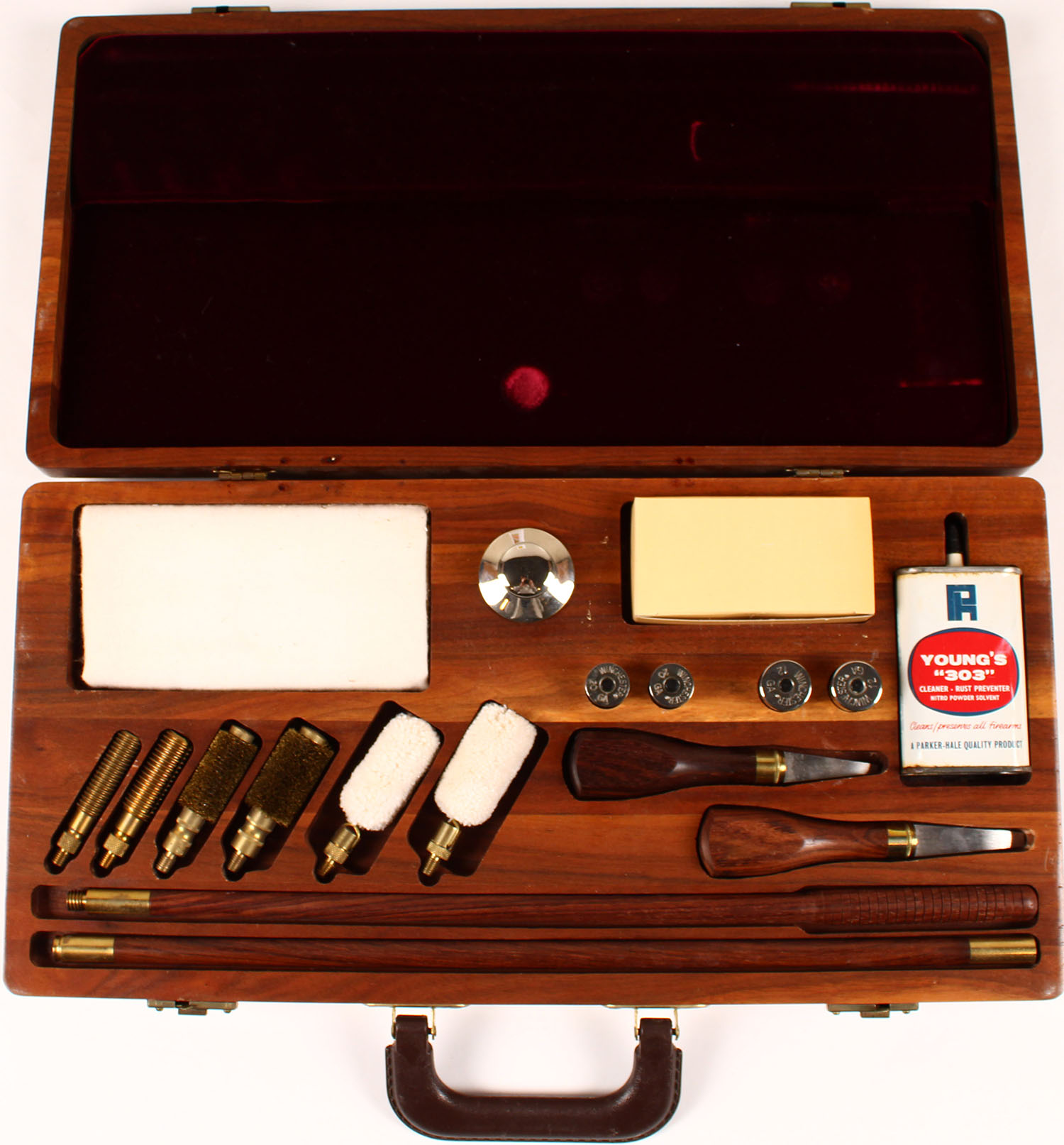 RARE! Winchester cleaning kit in wood box, FULL & COMPLETE with oil tin from Parker and Hale, maybe a British made kit, all bright and clean but oil tin has leaked out and cause soiling to itself and case. Grade: Excellent - Value: 100 to 300
