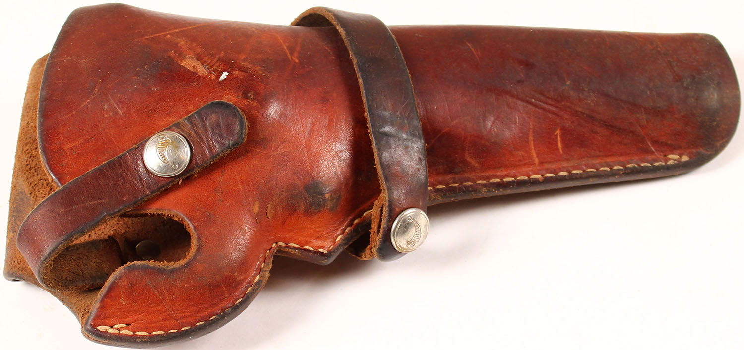 Hunter Leather pistol holster, 1100 14, has scuffing, has age soiling. Grade: Very good - Value: 6 to 60