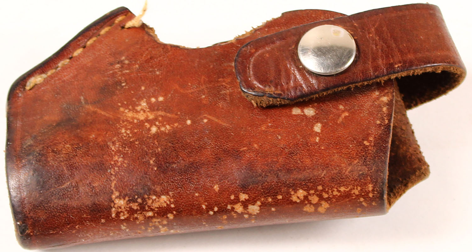 Unmarked Leather pistol holster, marked ''21 80'', has age soiling. Grade: Very good - Value: 2 to 40