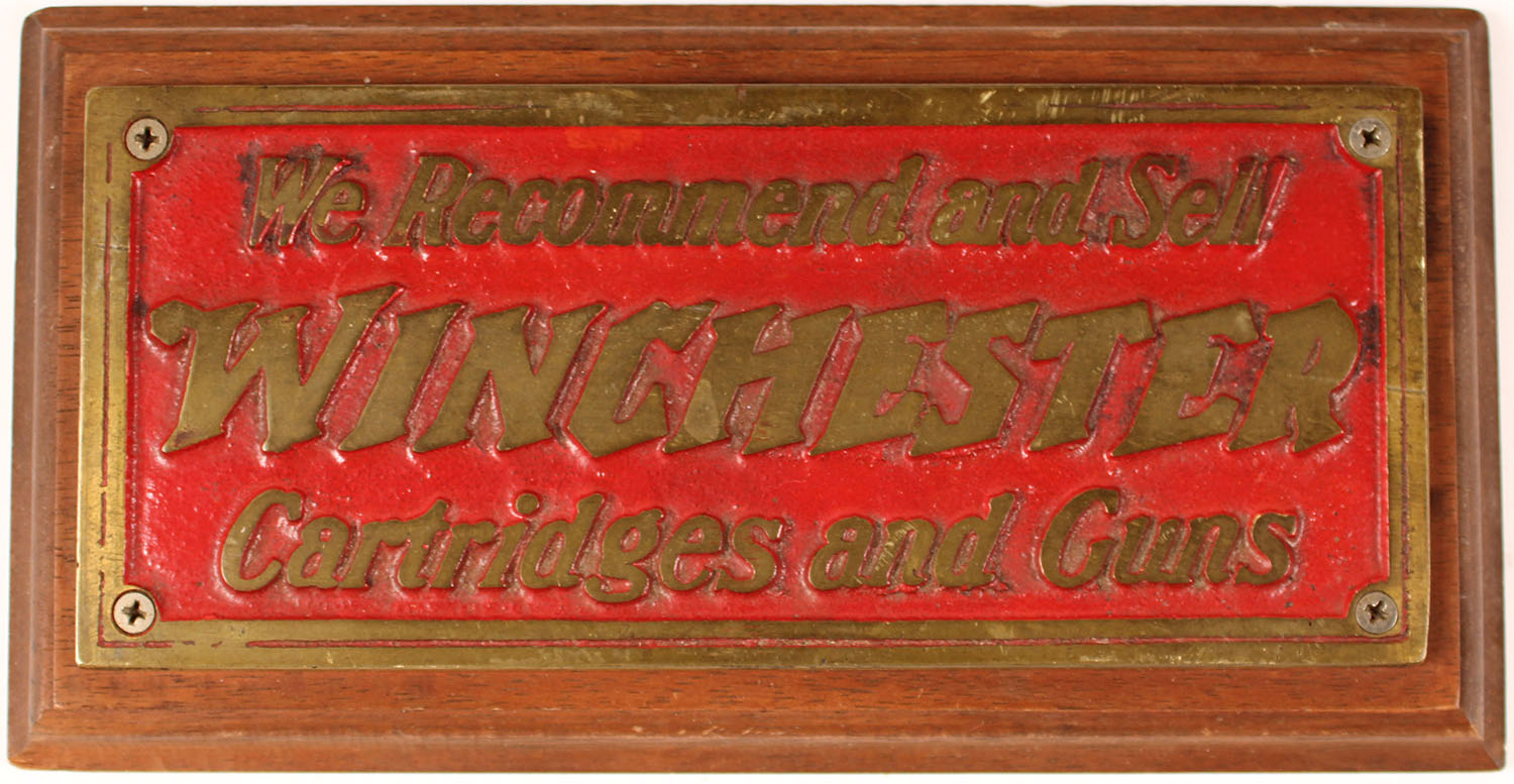 Winchester brass plaque, painted red, screwed into wood. Grade: Excellent - Value: 6 to 60