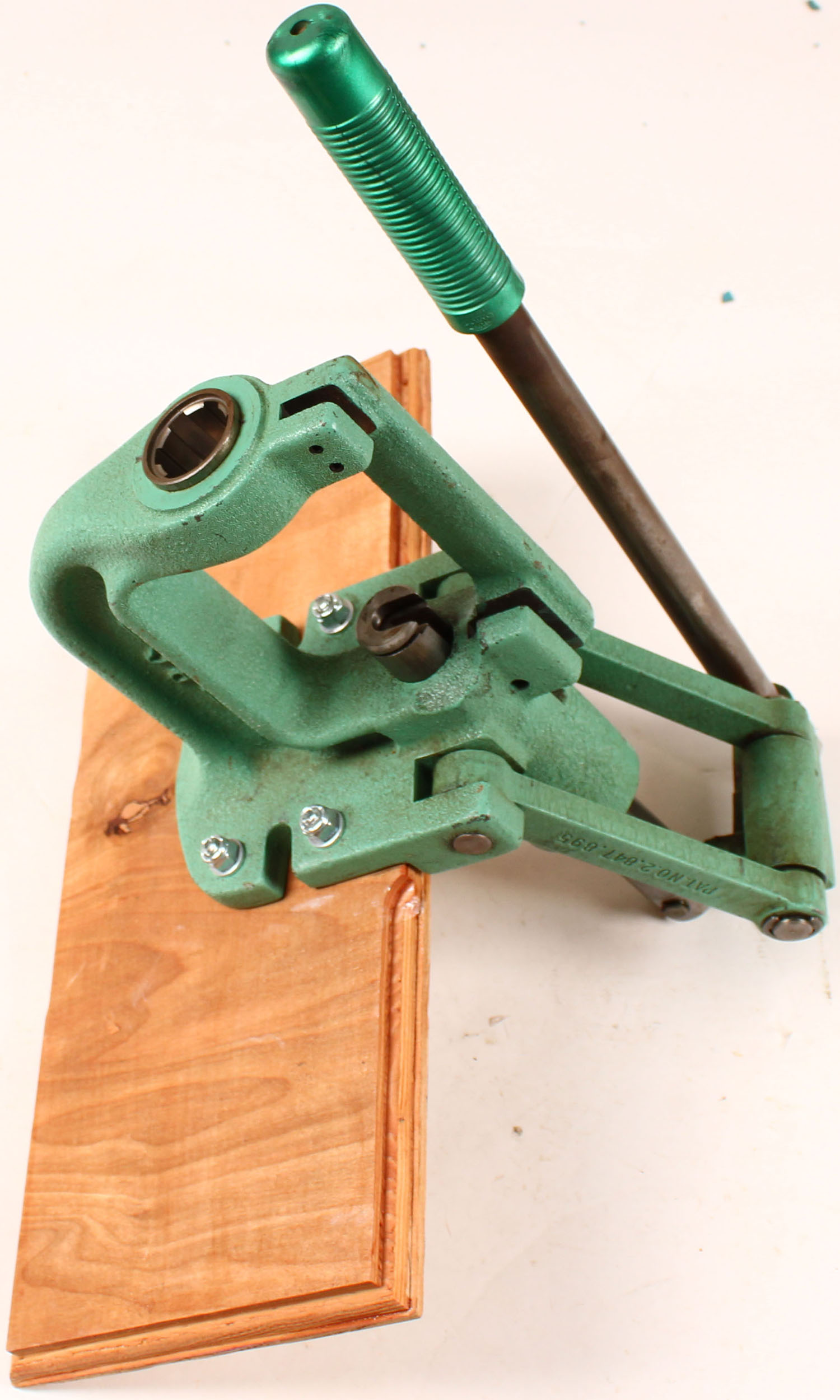 RCBS reloading press, solid, attached to wood plank. Grade: Excellent - Value: 10 to 100