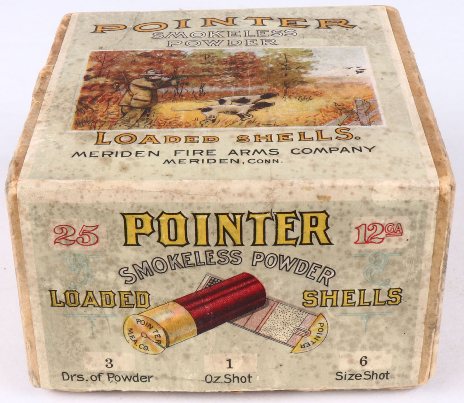Meriden Firearms Co., POINTER, 12ga, 2pc., Partial 1rd. fired, shot size 6 correct bottom, buff box with multi colored label pictures hunting scene on top, two crossed shells on one side & pointing dog on the other side, box has age soiling with light edge wear and the label is 100% intact with very nice colors, Shell is very good. Grade: Excellent - Value: 200 to 600