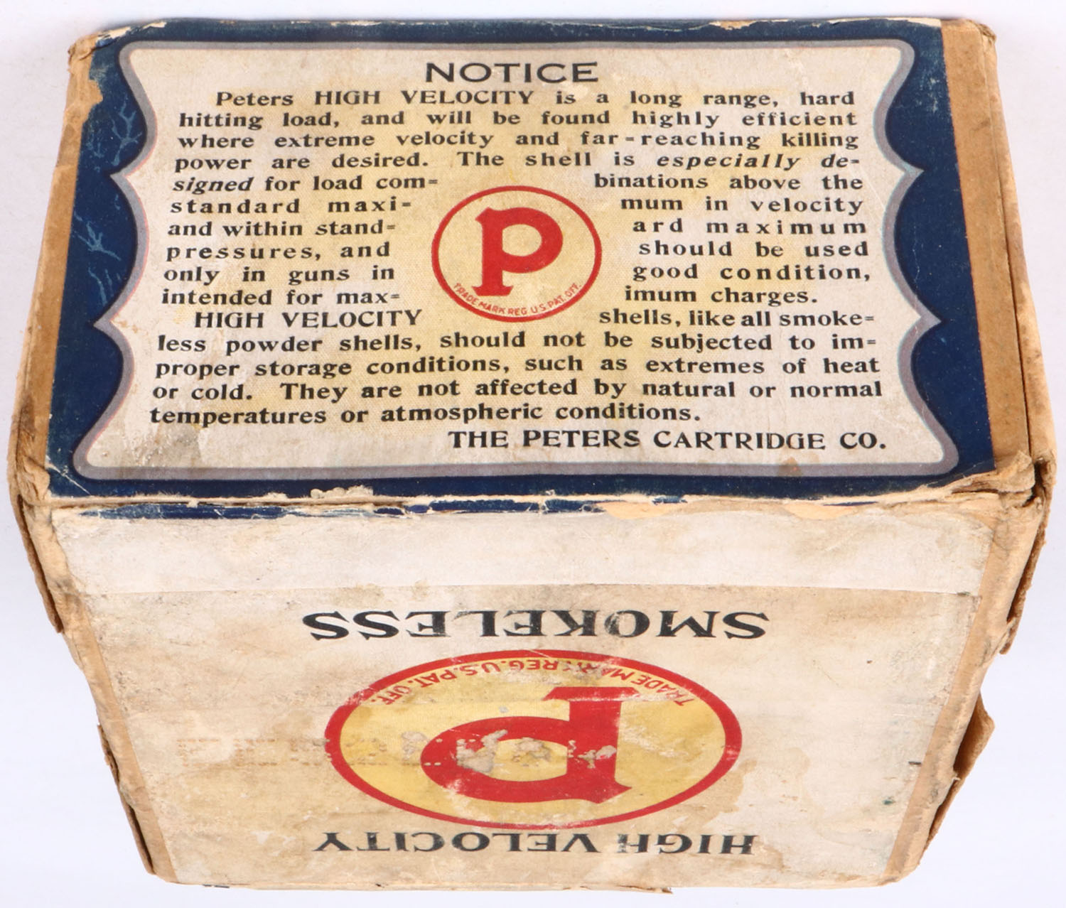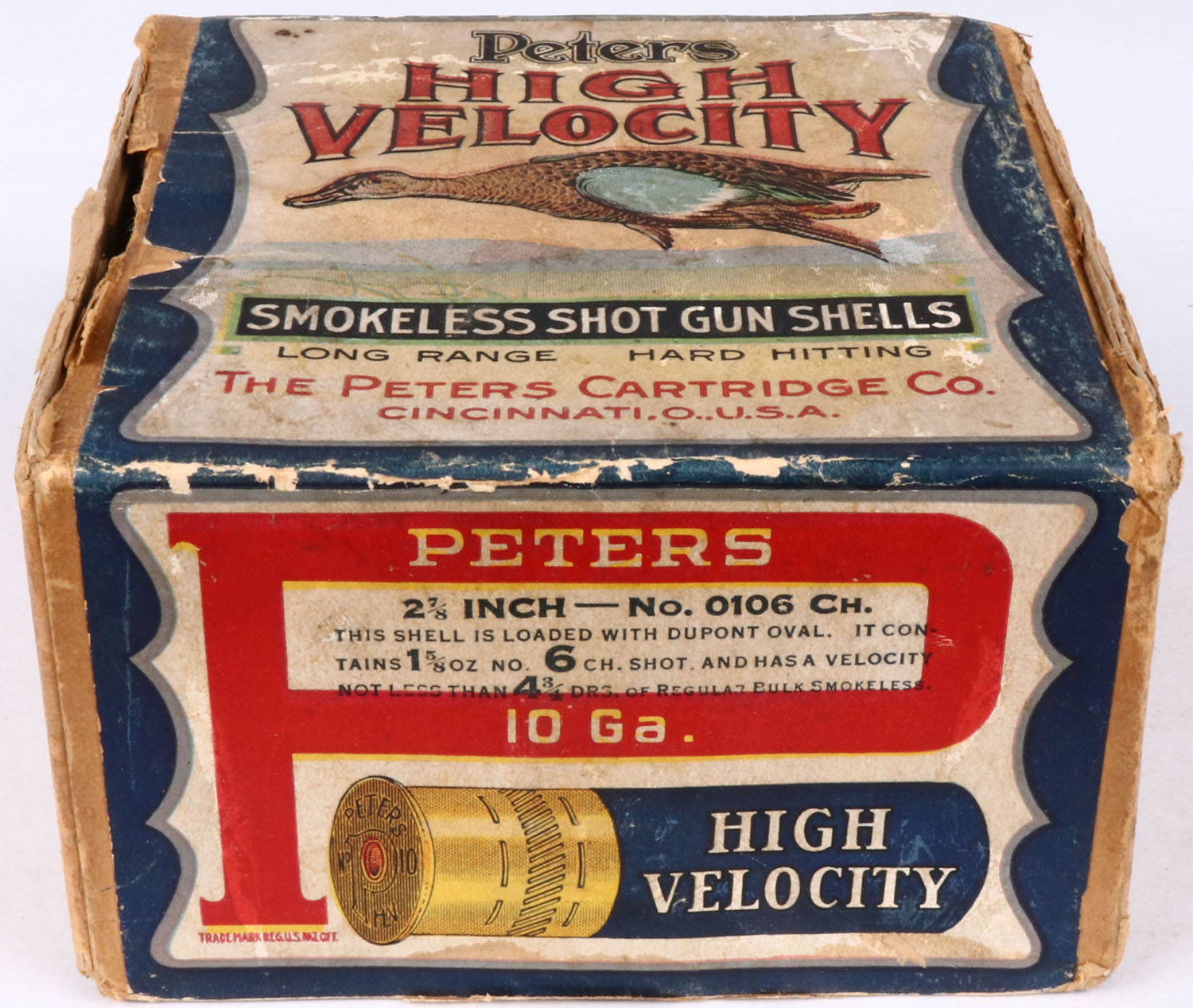 Peters Cart. Co., Blue Wing Teal, 10Ga., 2 7/8'', 2pc., Empty, shot size 6 CH, buff box with multi colored label that pictures Blue Wing Teal in flight, box has seam splits, age soiling, & light scuffing, with good label & good colors. Grade: Very Good + - Value: 60 to 200