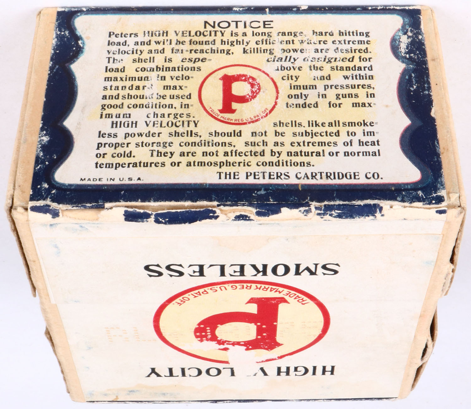 Peters Cart. Co., Blue Wing Teal, 16Ga., 2 9/16'', 2pc., Full, shot size 7 1/2CH, buff box with multi colored label that pictures Blue Wing Teal in flight, box is solid has great label with light soiling, has small shell protrusions, Shells are excellent. Grade: Excellent ++ - Value: 400 to 800