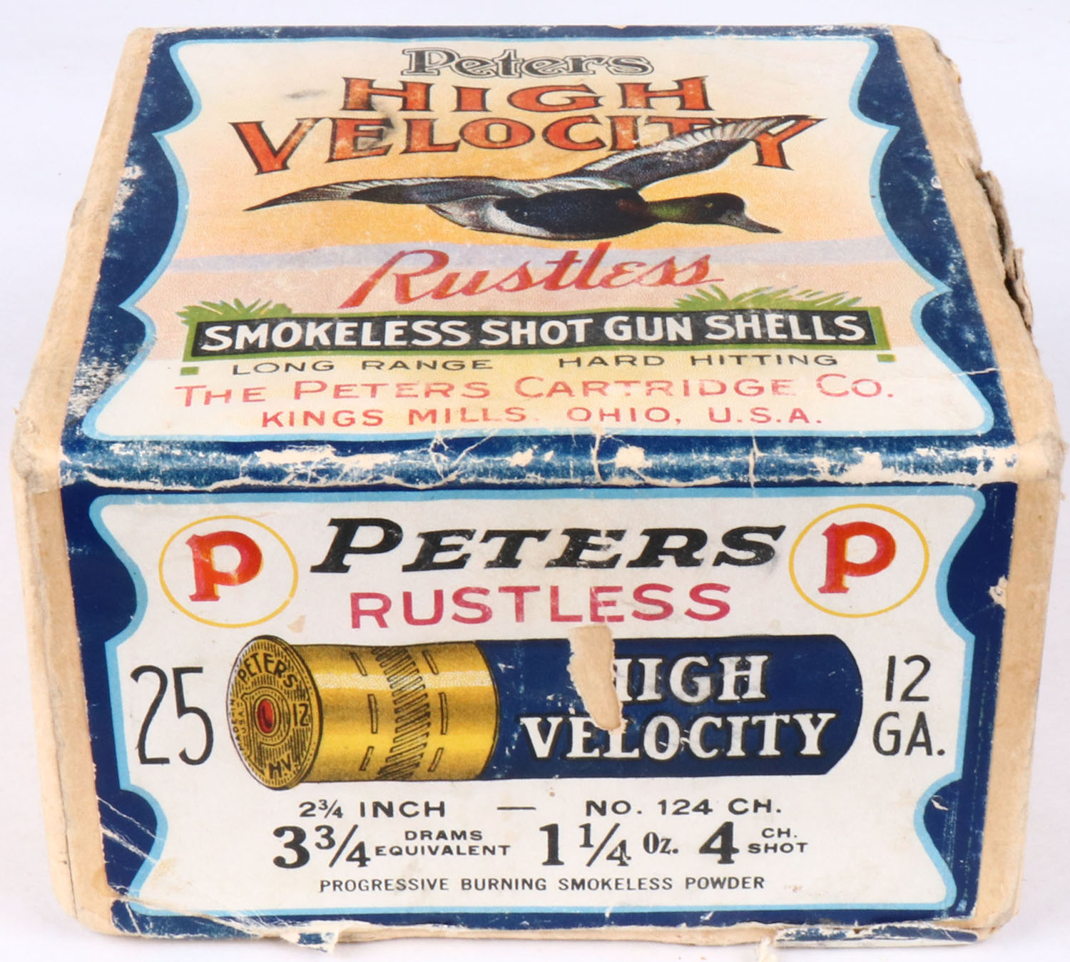 Peters Cart. Co., Blue Bill with insert, 12ga., 2pc., Full, shot size 4CH shot, buff box with multi colored label that pictures Blue Bill in flight, box has light soiling, seam split, edge wear & box is solid with very good colors. Grade: Excellent - Value: 100 to 500
