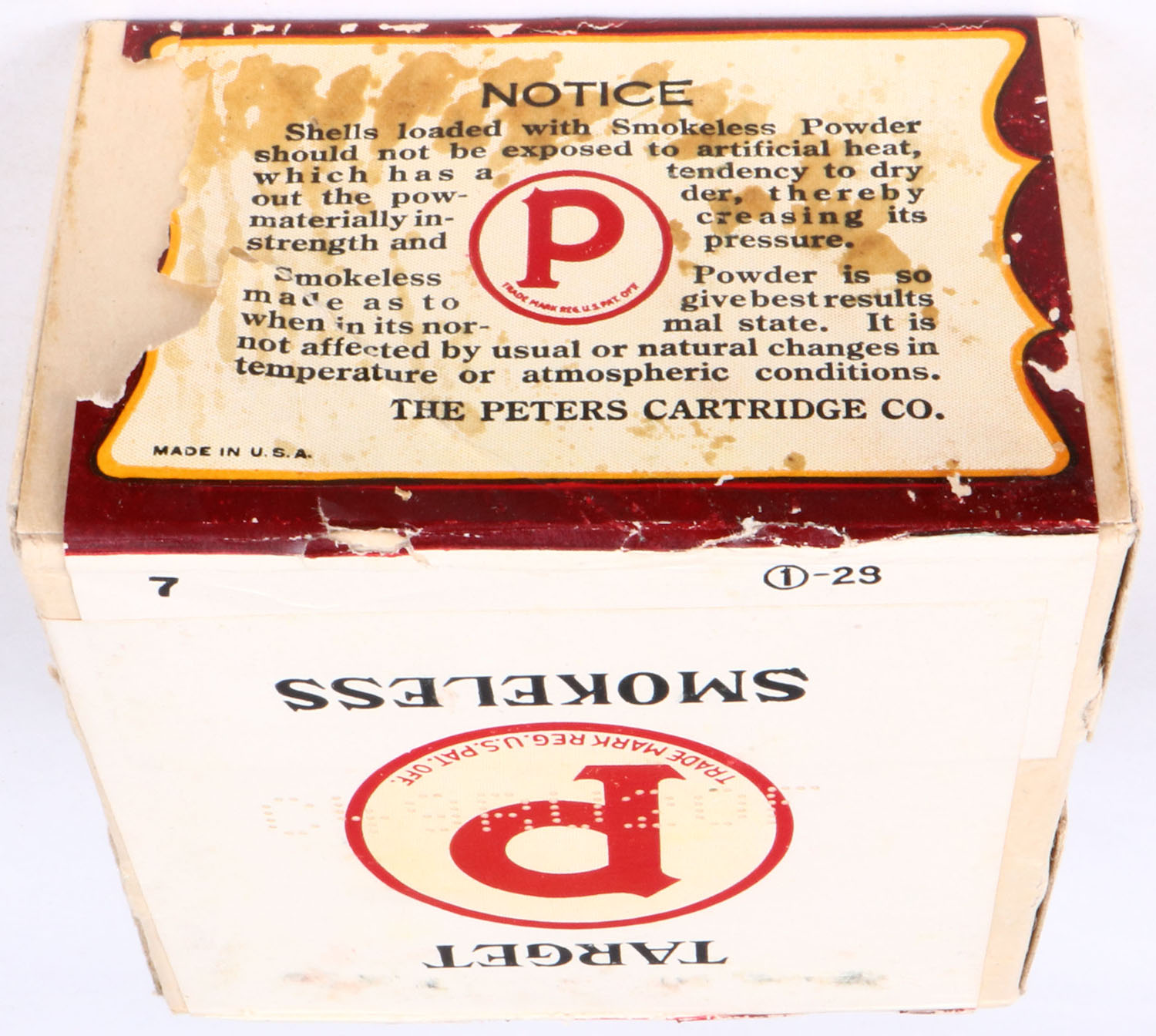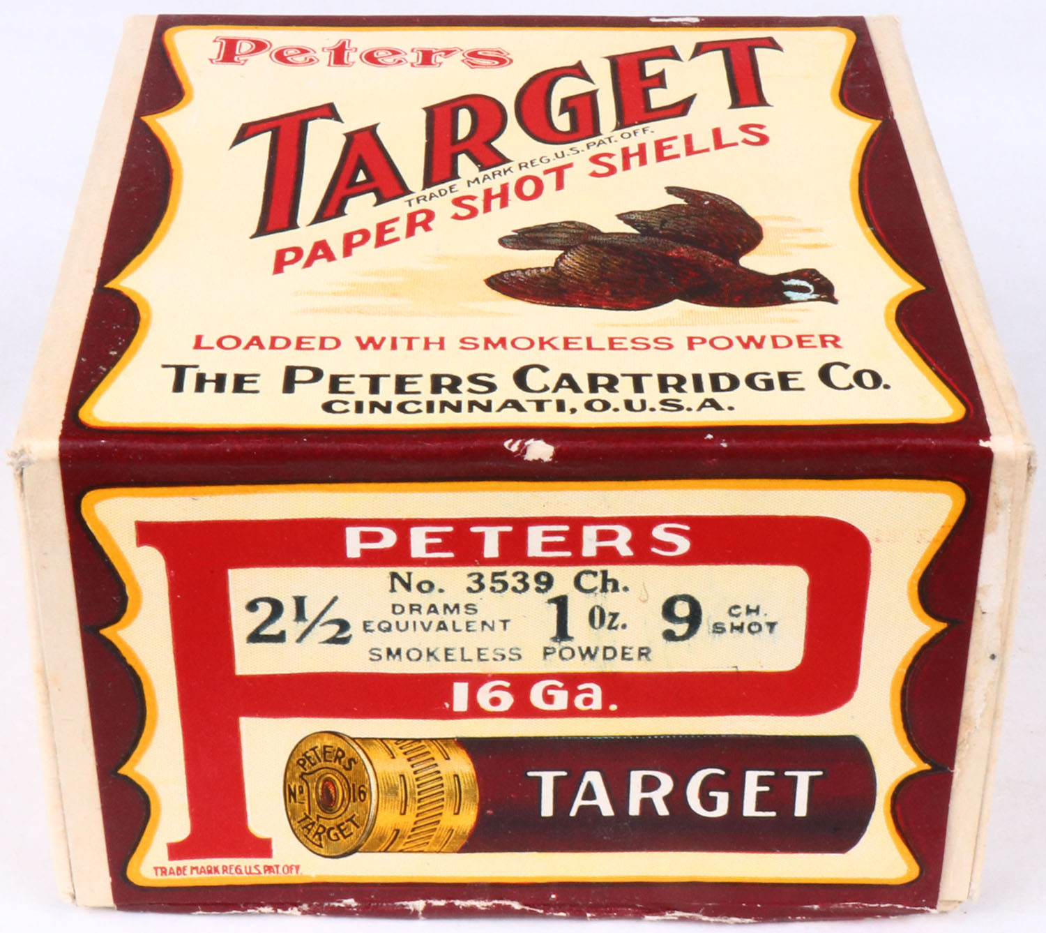 Peters Cart. Co., TARGET, 16ga., 2pc., FULL & SEALED, shot size 9CH Shot, buff box with multi-colored label with Quail in flight, box has great label being 92% intact but has soiling on side label. Grade: Excellent ++ - Value: 60 to 250