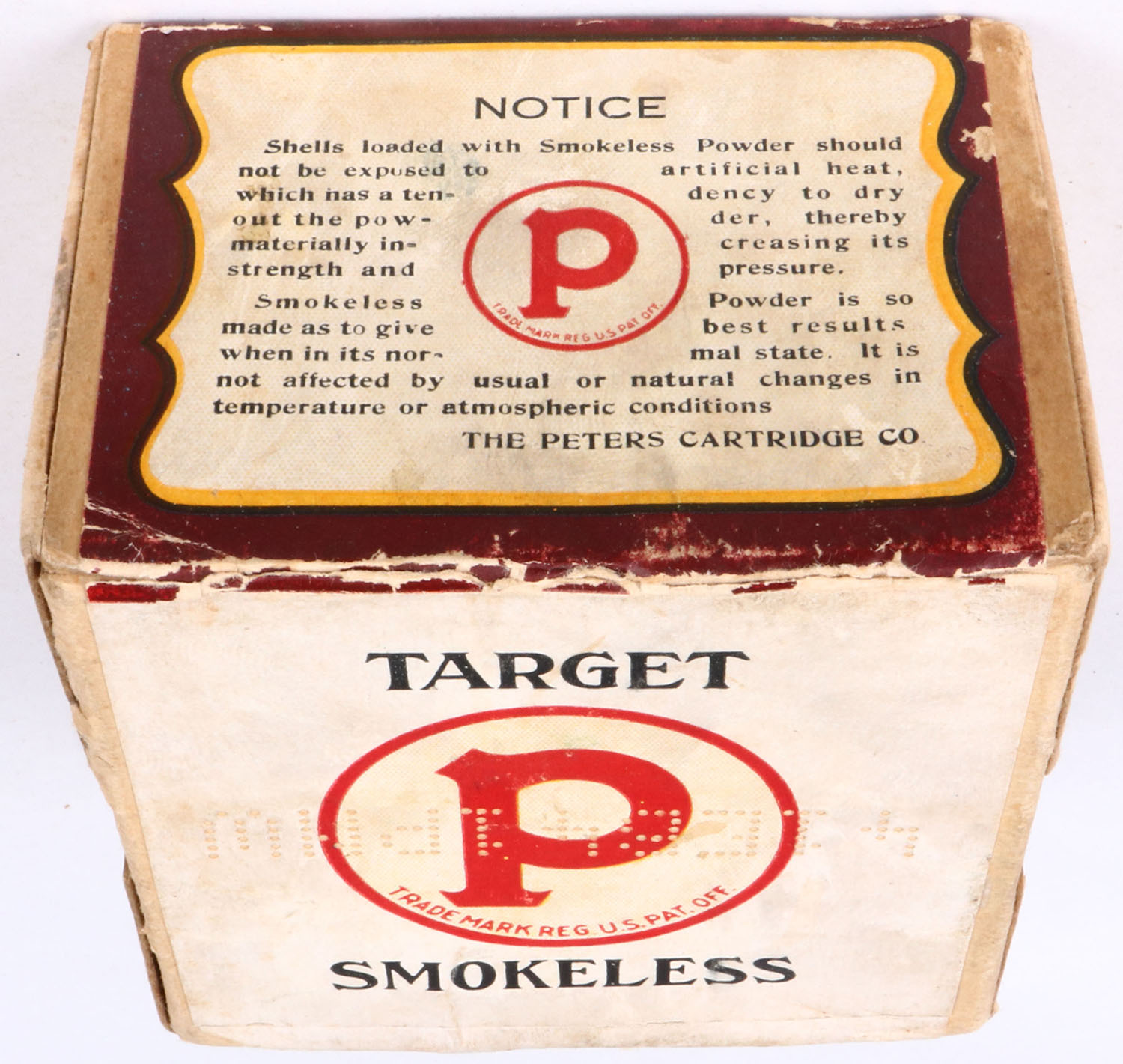 Peters Cart. Co., TARGET, 28ga., 2pc., Empty, shot size 4 Ch Shot, buff box with multi-colored label with Quail in flight, box is very solid with light soiling. Grade: Excellent + - Value: 60 to 200