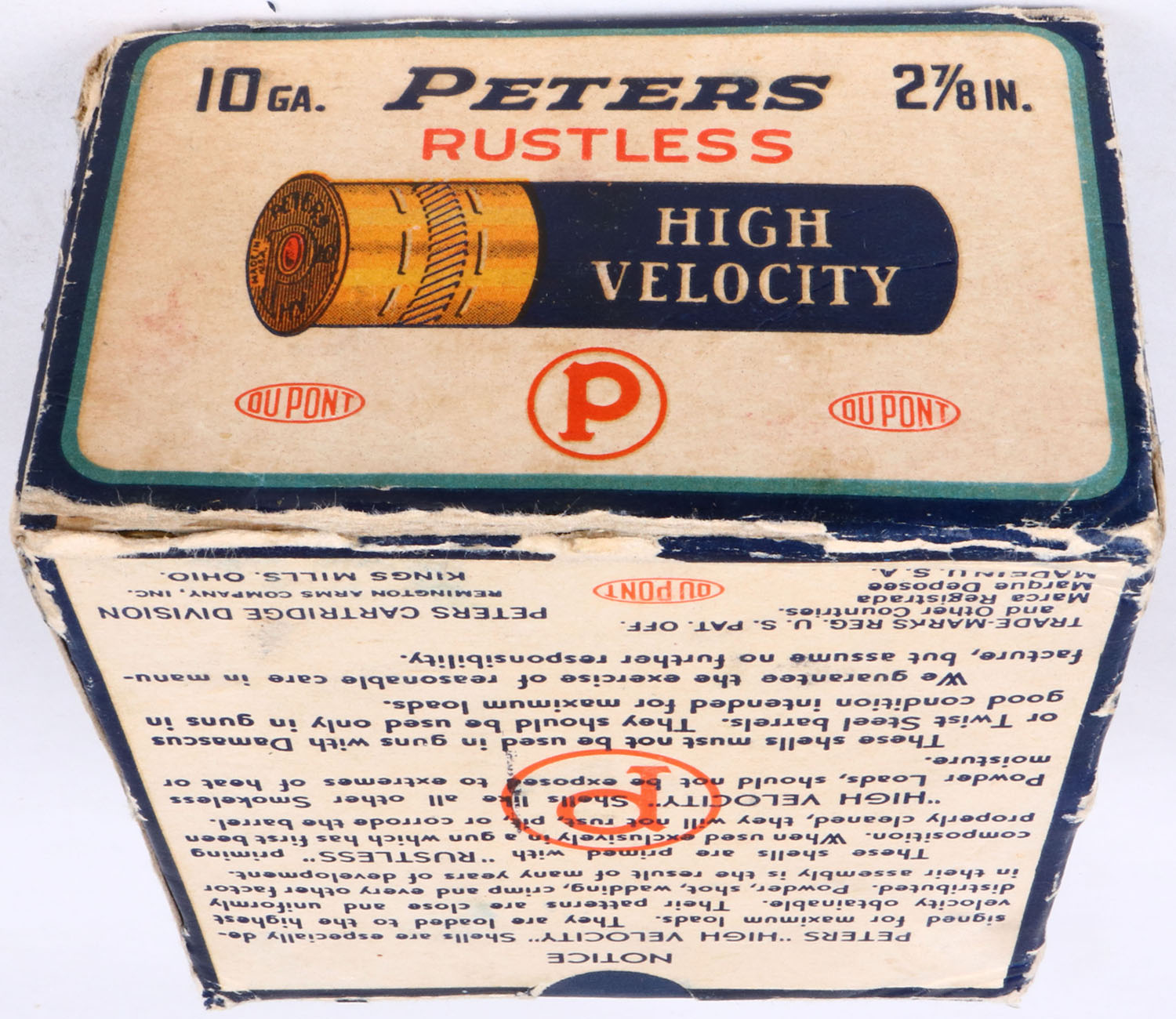 Peters Cart. Co., Kings Mills, OH, High Velocity, 10ga., 1pc., Full, shot size 6, multi colored box that pictures mallard flying out of the marsh grass, box is solid with edge wear, seam splits & bottom flap is almost disconnected, box has very nice colors, shells are excellent. Grade: Excellent - Value: 40 to 100