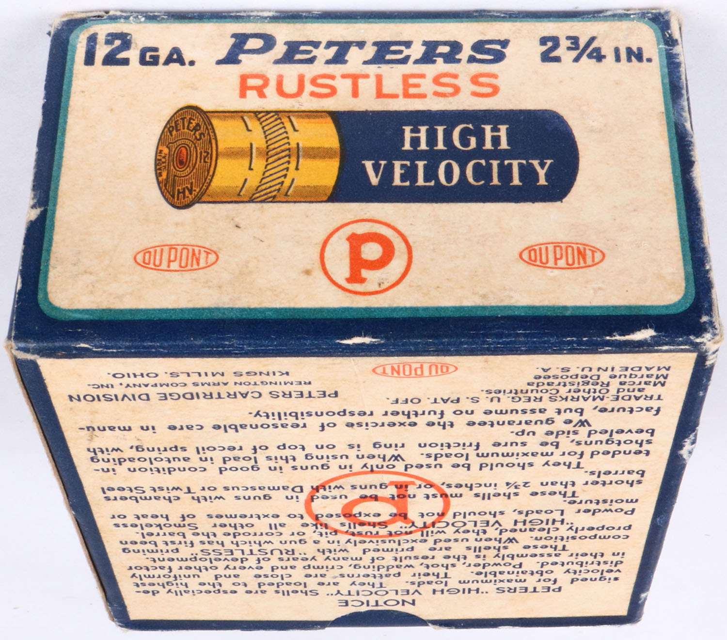 Peters Cart. Co., Kings Mills, OH, High Velocity U.S. Property, 12ga., 1pc., Full, shot size 00 Buck, multi colored box that pictures mallard flying out of the marsh grass, box is very solid with great colors, box has light edge wear & light soiling, shells are excellent. Grade: Excellent + - Value: 20 to 80