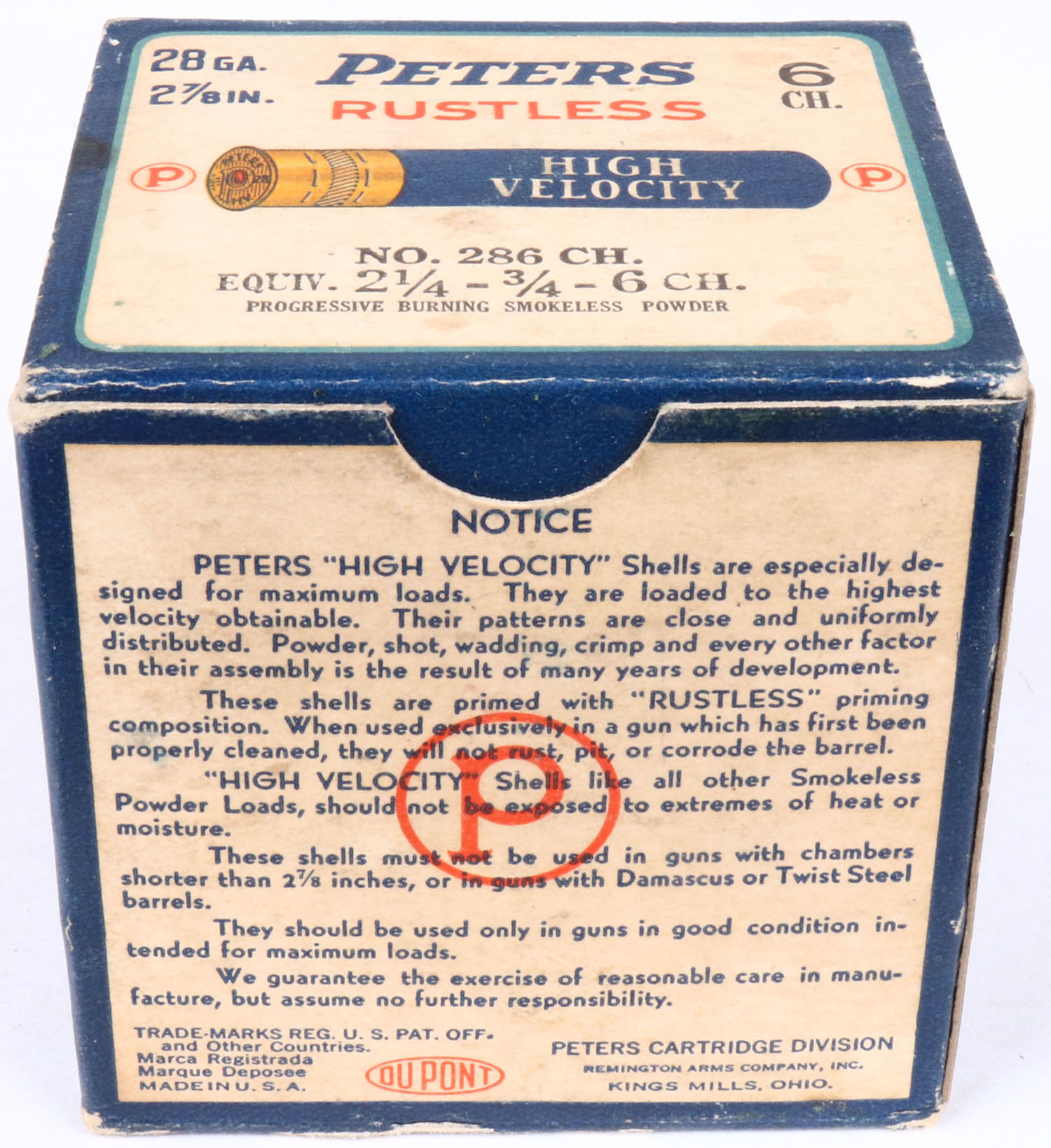 Peters Cart. Co., Kings Mills, OH, High Velocity, 28ga., 1pc., Full, shot size 6 CH, multi colored box that pictures mallard flying out of the marsh grass, box is solid with very nice colors, box has light age soiling & light edge wear, shells are very good. Grade: Excellent - Value: 20 to 80