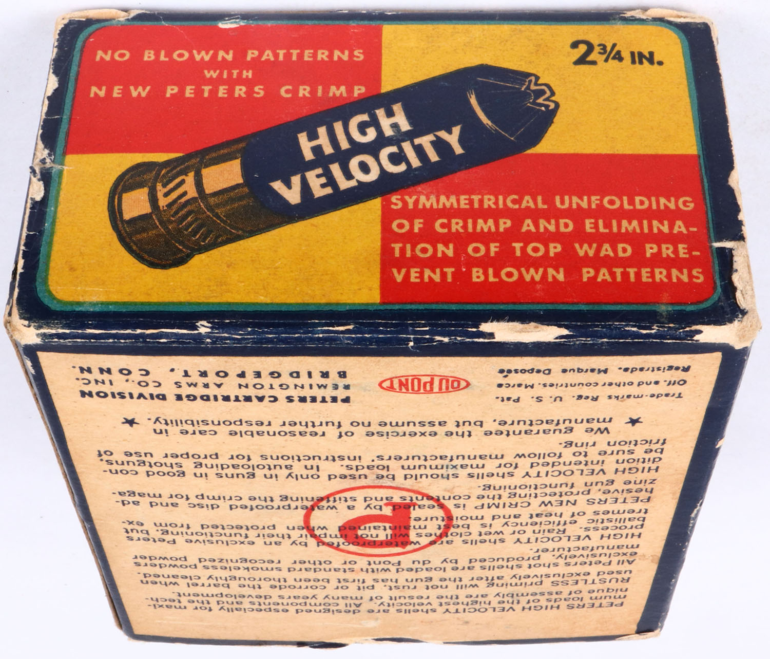 Peters Cart. Co., High Velocity, New Peters Crimp, 12ga., 1pc., Partial 15rds, shot size 6, multi colored box that pictures mallard flying out of the marsh grass, paper shells, box is solid with edge wear & light soiling, shells are excellent. Grade: Excellent - Value: 10 to 60