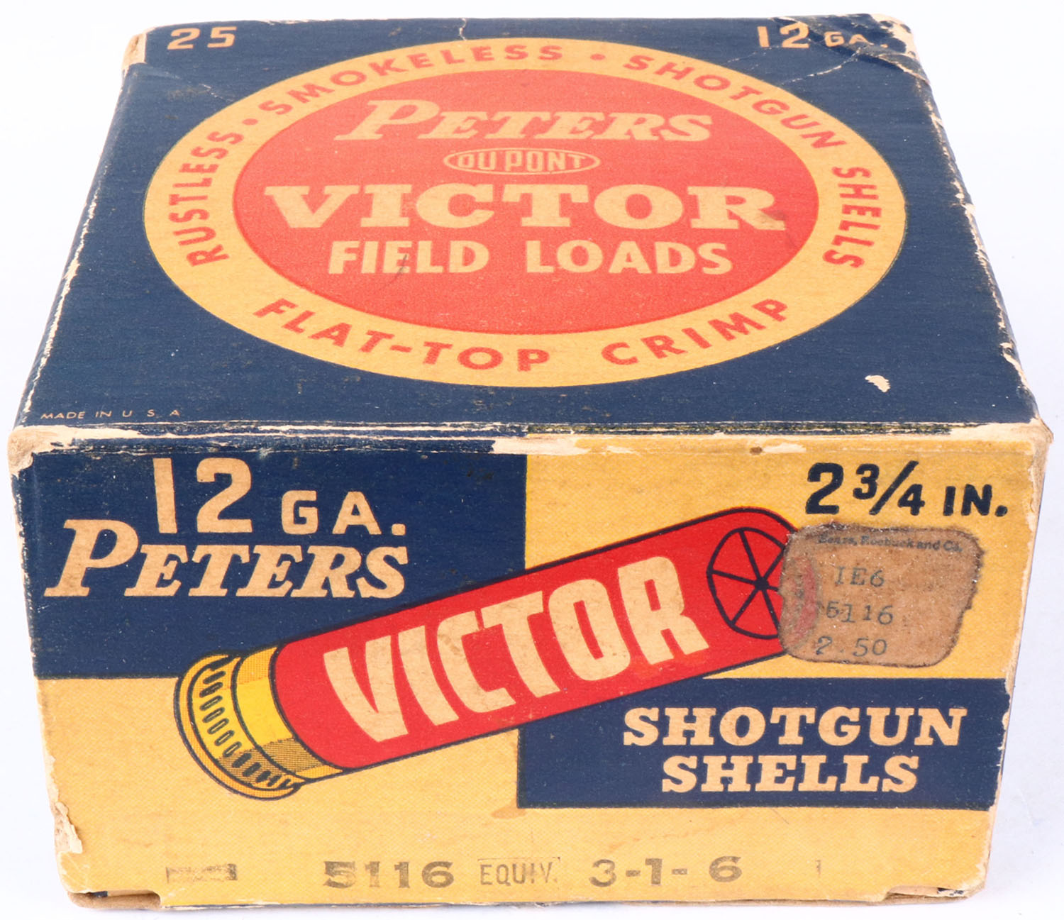 Peters, VICTOR FIELD LOADS, 12ga., 1pc., Empty, shot size 6, blue, white & red box, box is solid with very nice color, box has light age soiling & light edge wear. Grade: Very Good ++ - Value: 8 to 30