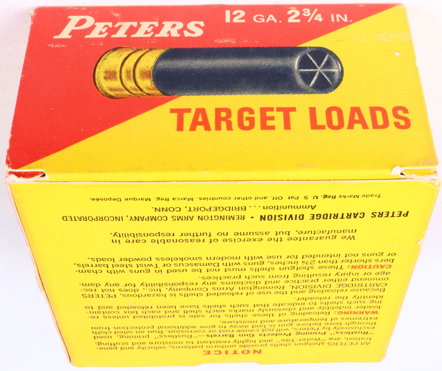 Peters, TARGET LOADS, 12ga., 1pc., Full, shot size 8, red, blue & yellow box, box is very solid with excellent colors, shells are excellent. Grade: Excellent ++ - Value: 10 to 30