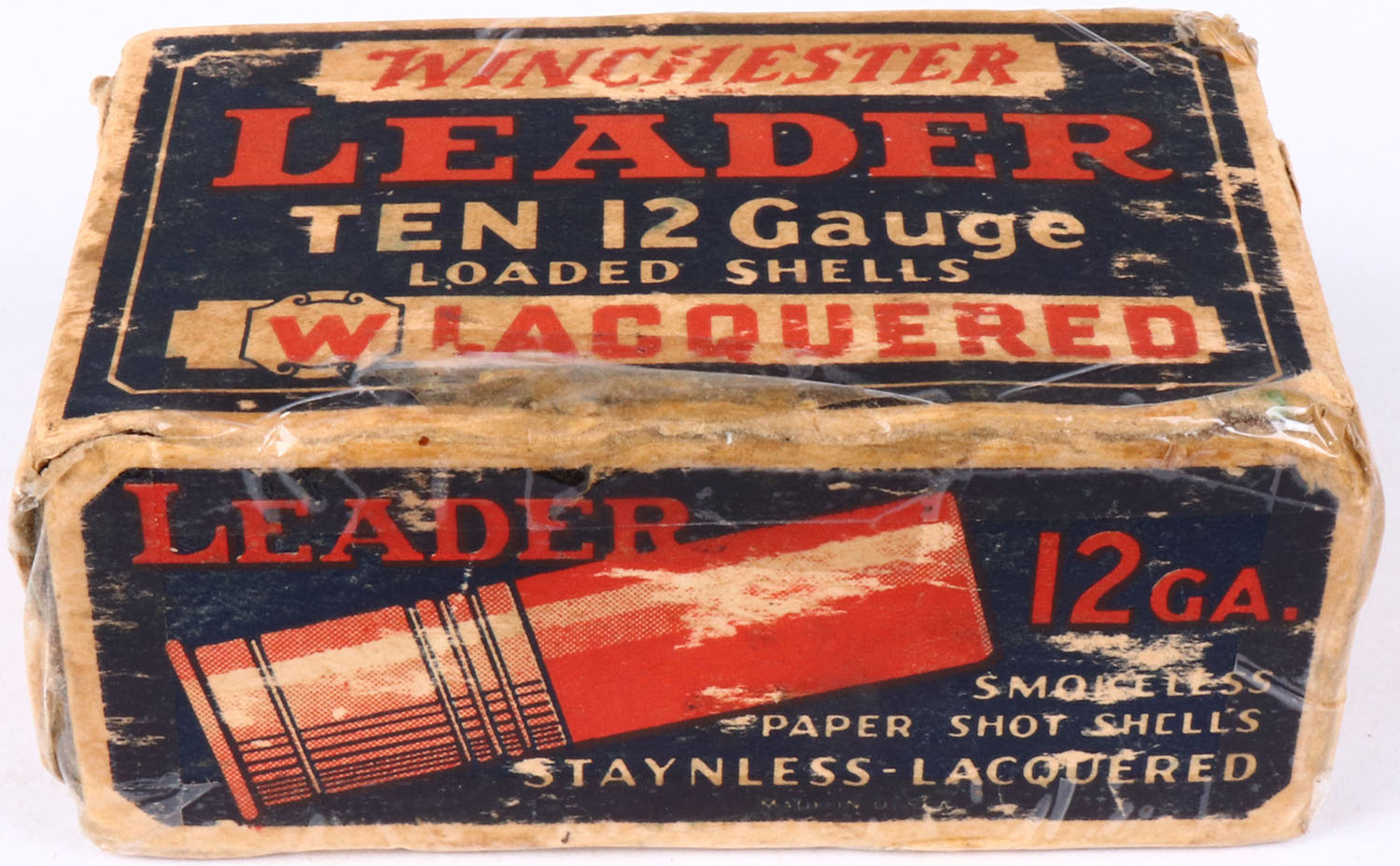 Winchester, LEADER, LACQUERED and STAYNLESS, 12ga., 1pc., Full, shot size 8, Buff, red and blue box colors are very nice, 2 5/8'', box has tape repair, seam splits, soiling & scuffing with missing inside top flap, shells are Exceptional, VERY SCARCE BOX!!! Grade: Very Good + - Value: 80 to 200