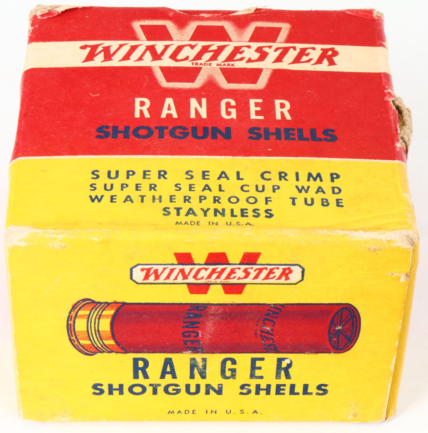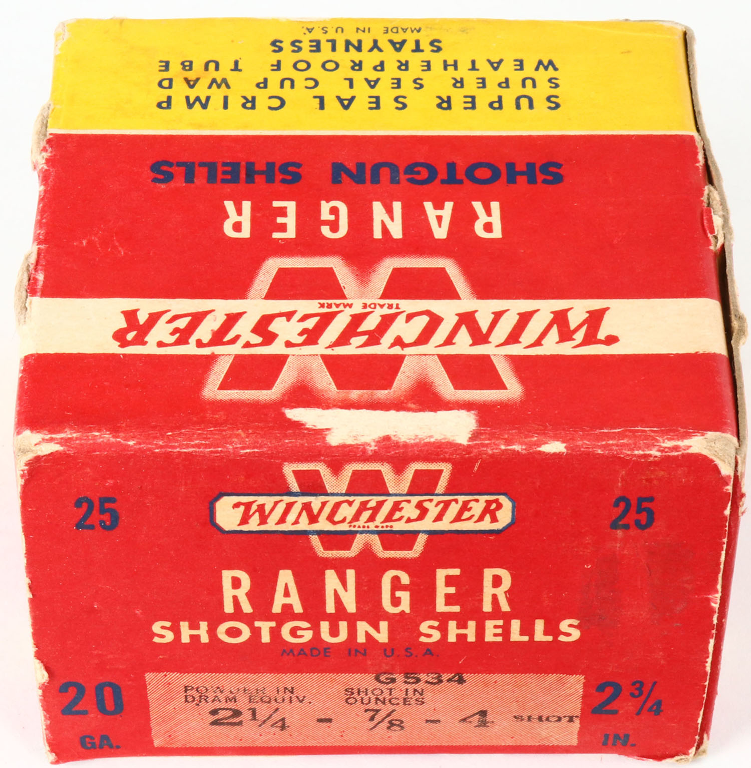 Winchester, Ranger, 20ga., 1pc., Full, shot size 4, red, white & yellow box, Box has shell protrusions with great colors, shells are excellent. Grade: Excellent - Value: 10 to 30