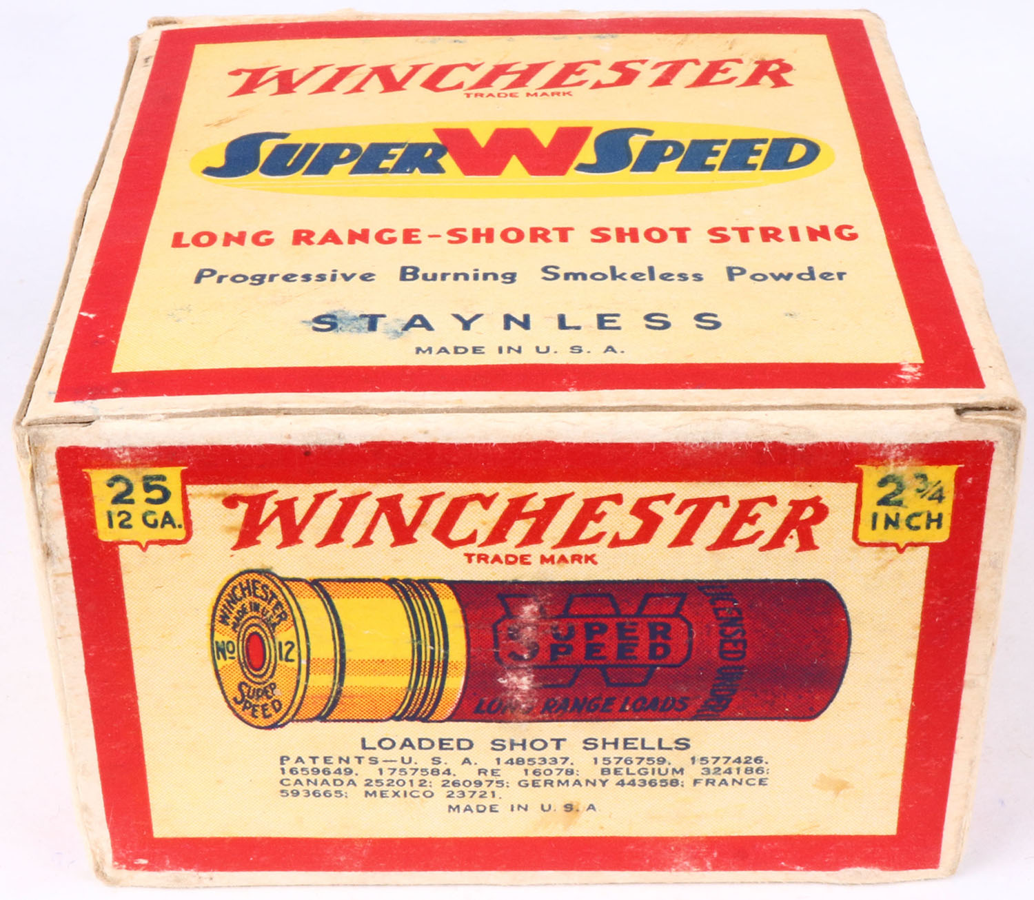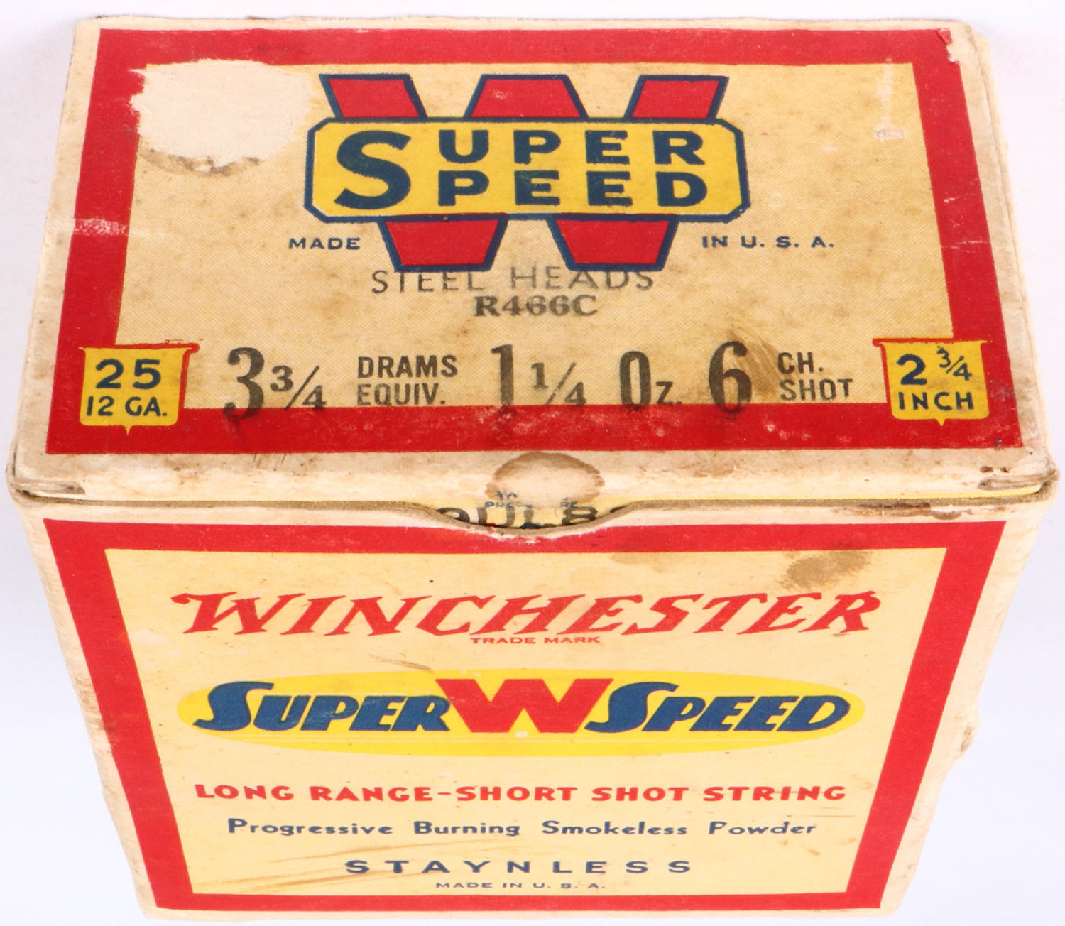 Winchester, Super W Speed, 12ga., STEEL HEADS, Staynless, 2 3/4 in., 1pc., FULL, shot size 6CH, cream red, blue and yellow box, box is solid with very good colors, shows some age soiling shells are very good. Grade: Excellent - Value: 20 to 40