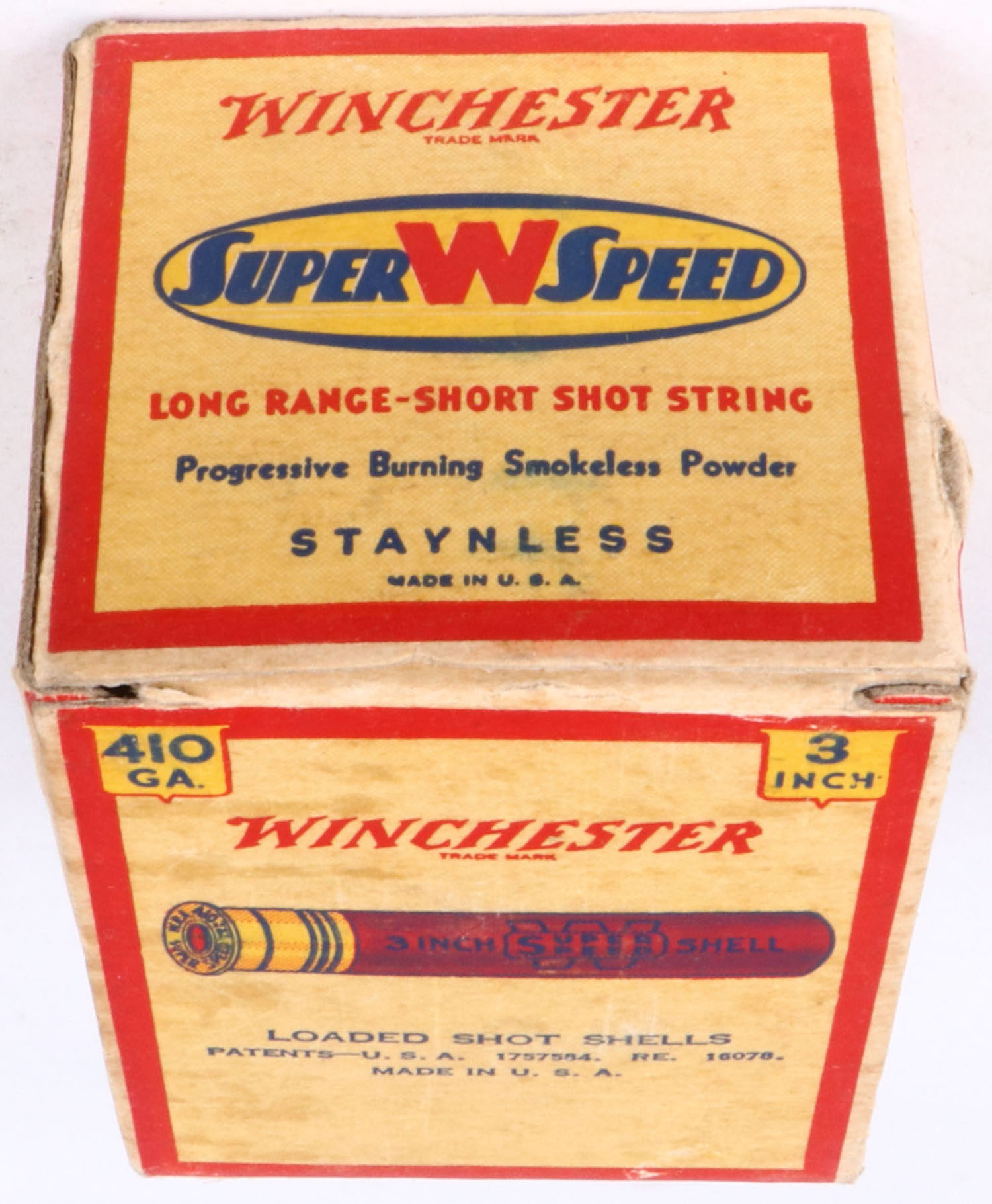 Winchester, Super W Speed, 410ga., Staynless, 3'', 1pc., Full, shot size 7 1/2, cream red, blue and yellow box, box is solid with great colors, shows some light age soiling & few shell protrusions, shells are excellent. Grade: Excellent + - Value: 10 to 30