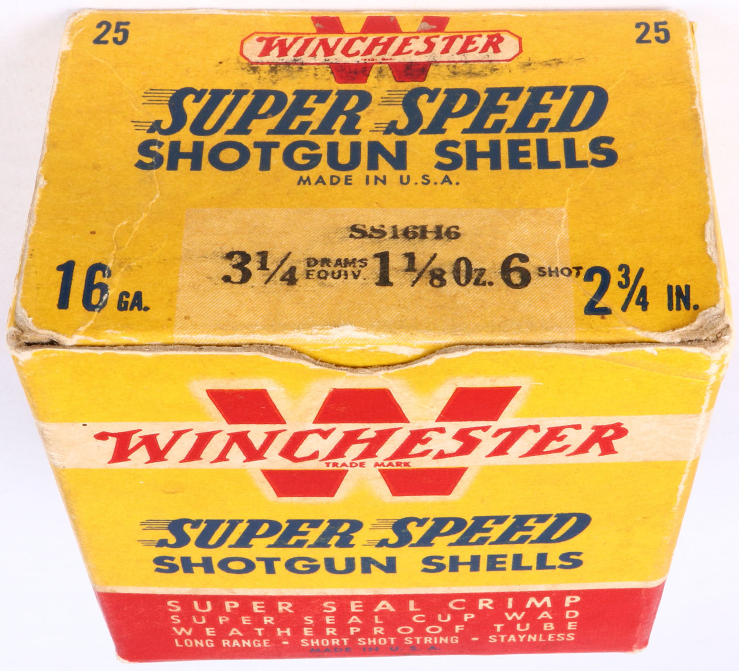 Winchester, Super Speed, 16ga., 1pc., Partial 7rds, 2 3/4''., shot size 6, red, yellow & blue box, box has light soiling & great colors, shells are excellent. Grade: Excellent - Value: 10 to 30