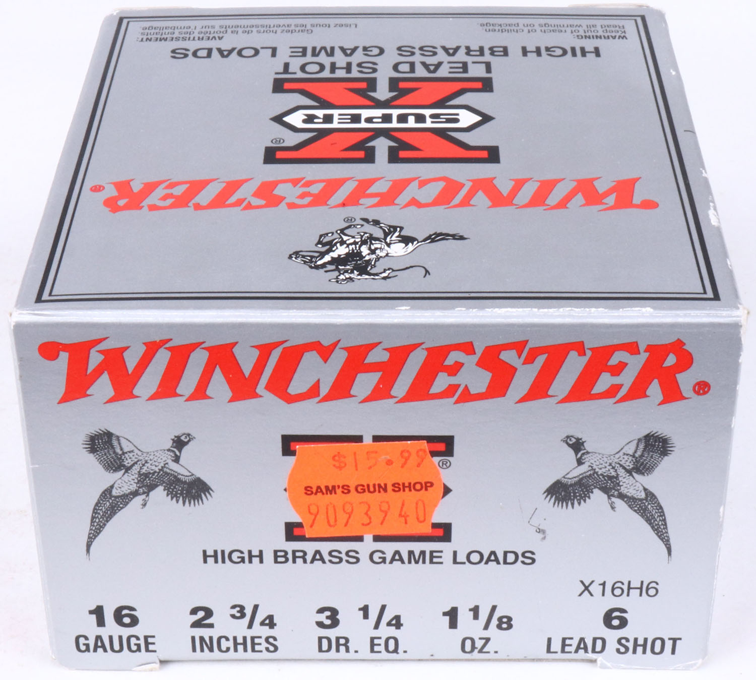 Winchester, Super X, 16ga., Full, shot size 6 Lead Shot, multi-colored box, solid box, ammo is excellent. Grade: Excellent + - Value: 8 to 20