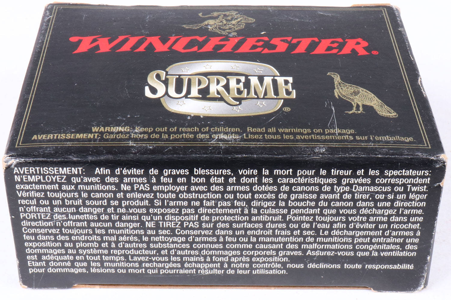 Winchester, Supreme Turkey Loads, 10ga., 1pc., Full, shot size 4, box is solid & shells are excellent. Grade: Excellent + - Value: 8 to 30