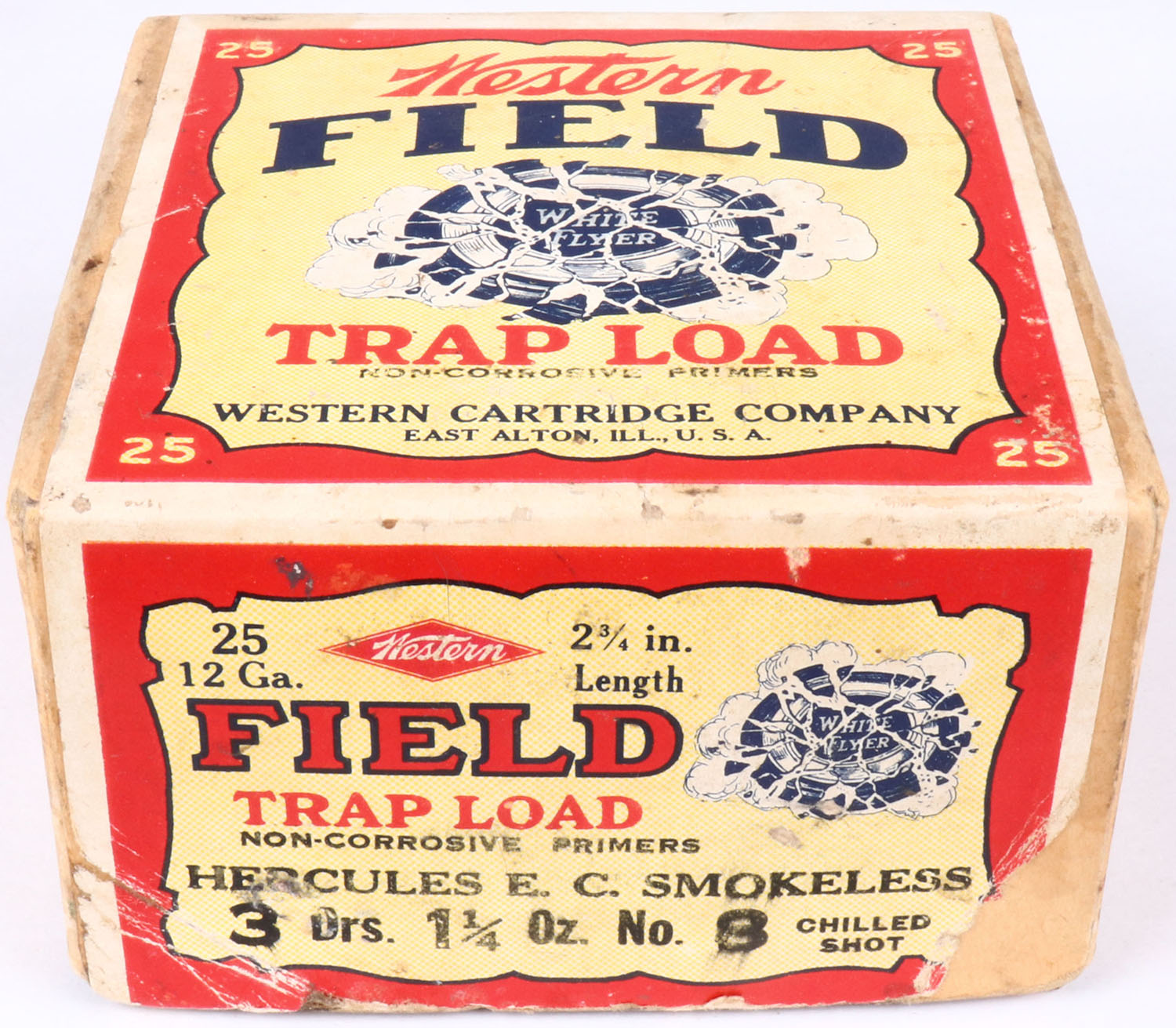 Western, Field Trap Load, 12ga., 2pc, Empty, shot size 8 Chilled, box has clap pigeon shattering, has age soiling, light edge wear with very good label. Grade: Excellent - Value: 200 to 800