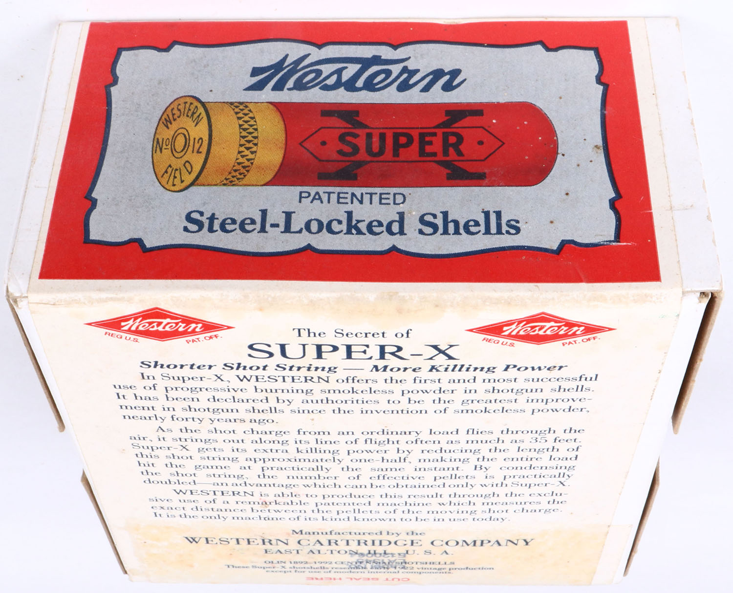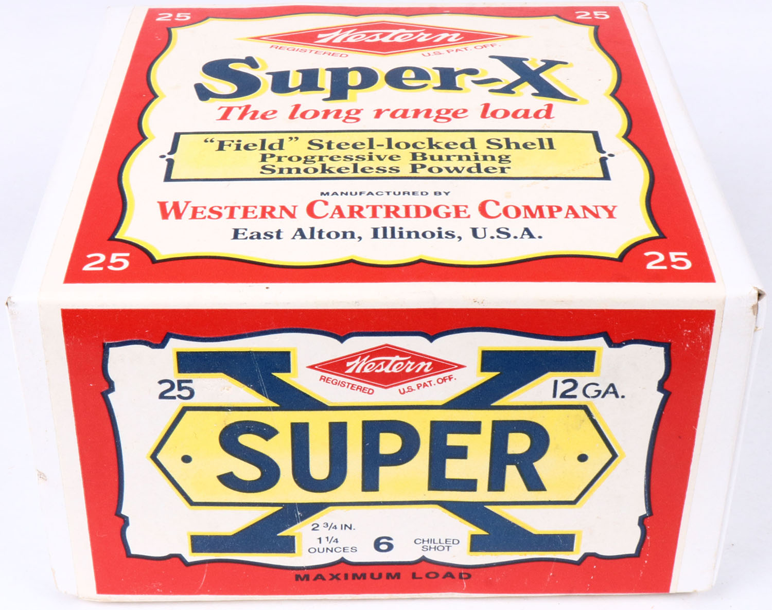 Western, Super-X, 12ga., 2pc., FULL & SEALED, shot size 6 Chilled Shot, 2 3/4'', white box with multi colored label, box & label are great, Circa 1990's. Grade: Excellent ++ - Value: 30 to 80