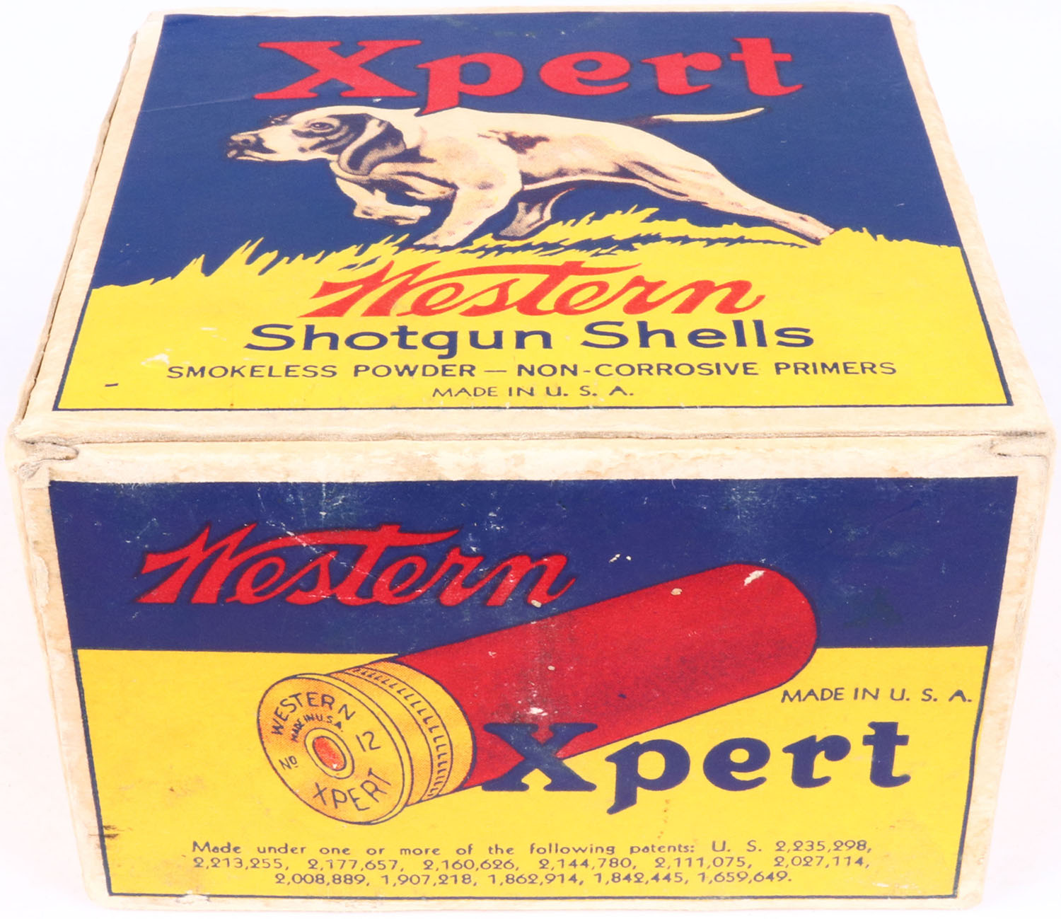 Western Cart. Co., Xpert, with U.S. PROPERTY blacked out, 12ga., 1pc., Partial 23rds., blue, yellow & red box with a dog on point, Loading: 9 Pellets No. 00 BUCKSHOT, box has minor scuffing with great colors, shells are excellent. Grade: Excellent + - Value: 30 to 120