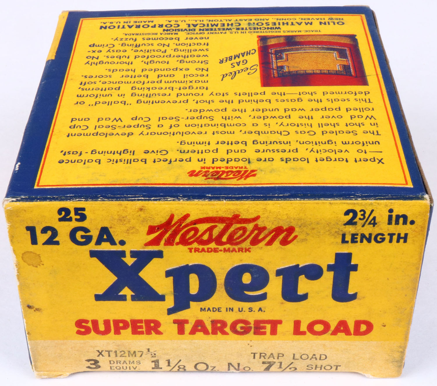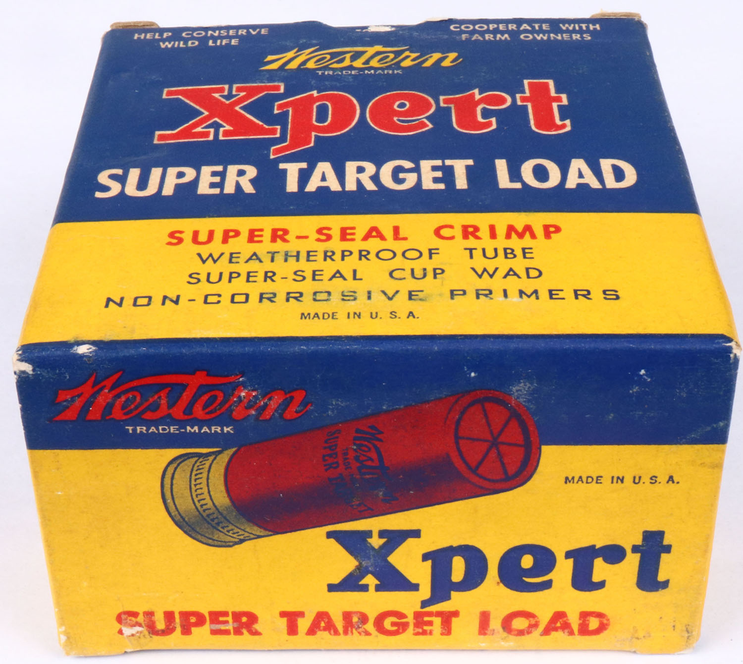 Western, Xpert, 12ga., 2 3/4'', 1pc., Full, shot size 7 1/2 Super Target Load, multi-colored box, box is very solid with light soiling, box has excellent colors, shells are excellent. Grade: Excellent + - Value: 10 to 30