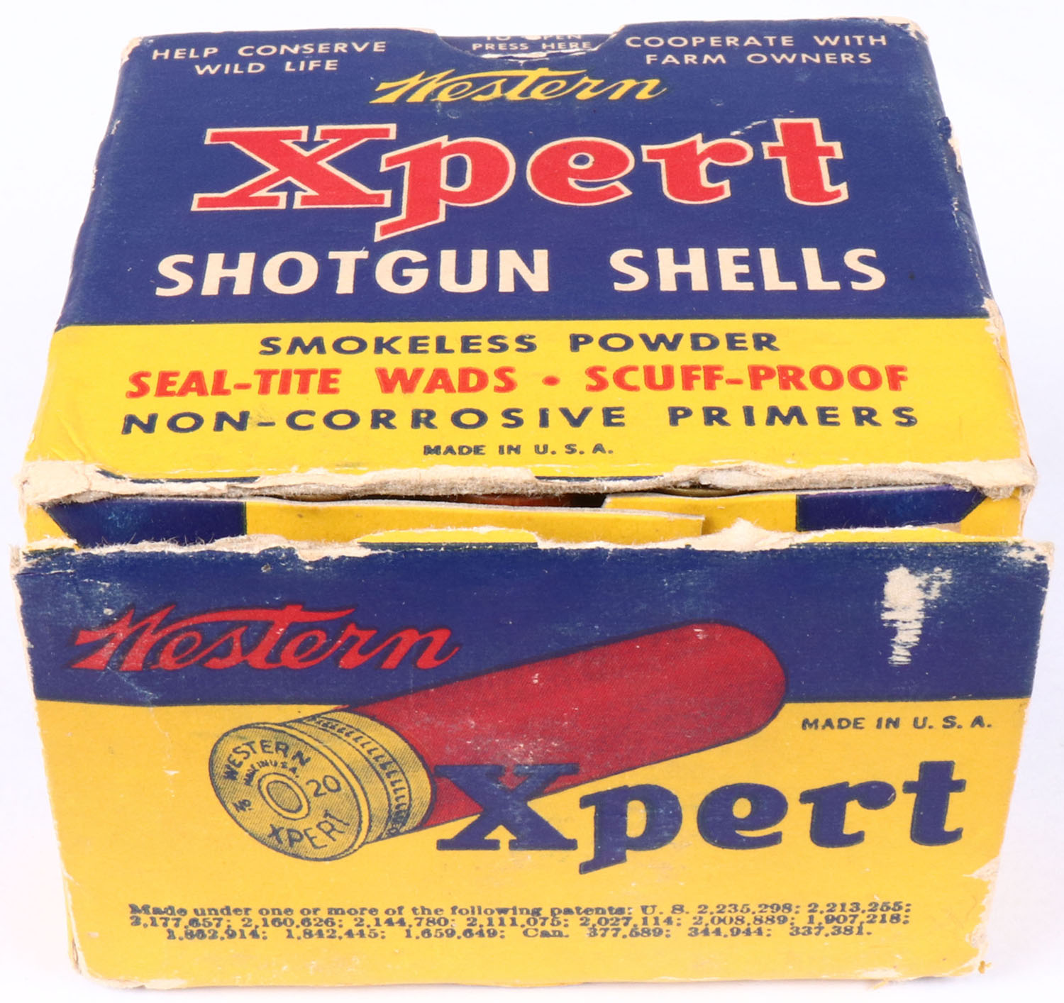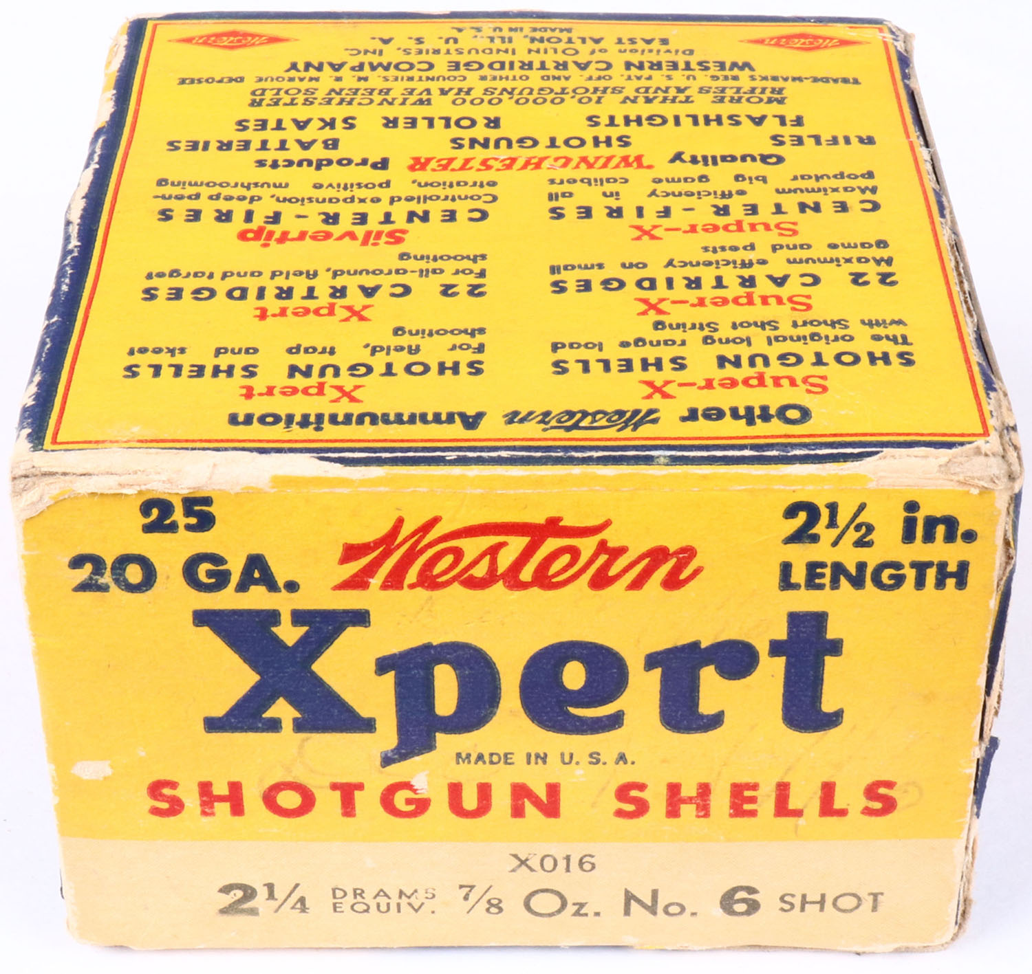 Western, Xpert, 20ga., 2 1/2'', 1pc., Full, shot size 6, multi-colored box, box has bottom flap disconnected & top inside flap is torn, with edge wear & scuffing, box has great colors, shells are excellent. Grade: Very Good ++ - Value: 10 to 30