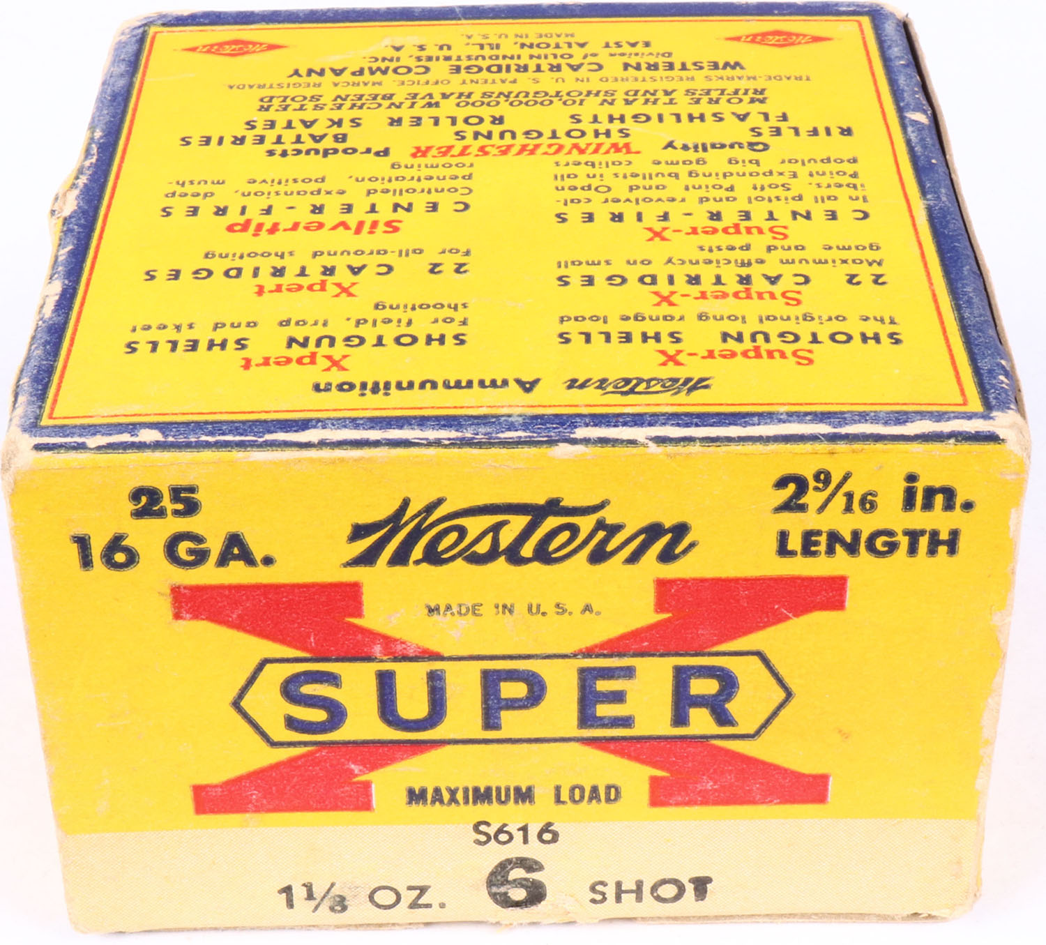 Western, Super X, 16ga., 2 9/16'', 1pc., Full, shot size 6, multi-colored box, box is solid with light edge wear, box has great colors, shells are excellent. Grade: Excellent - Value: 10 to 30