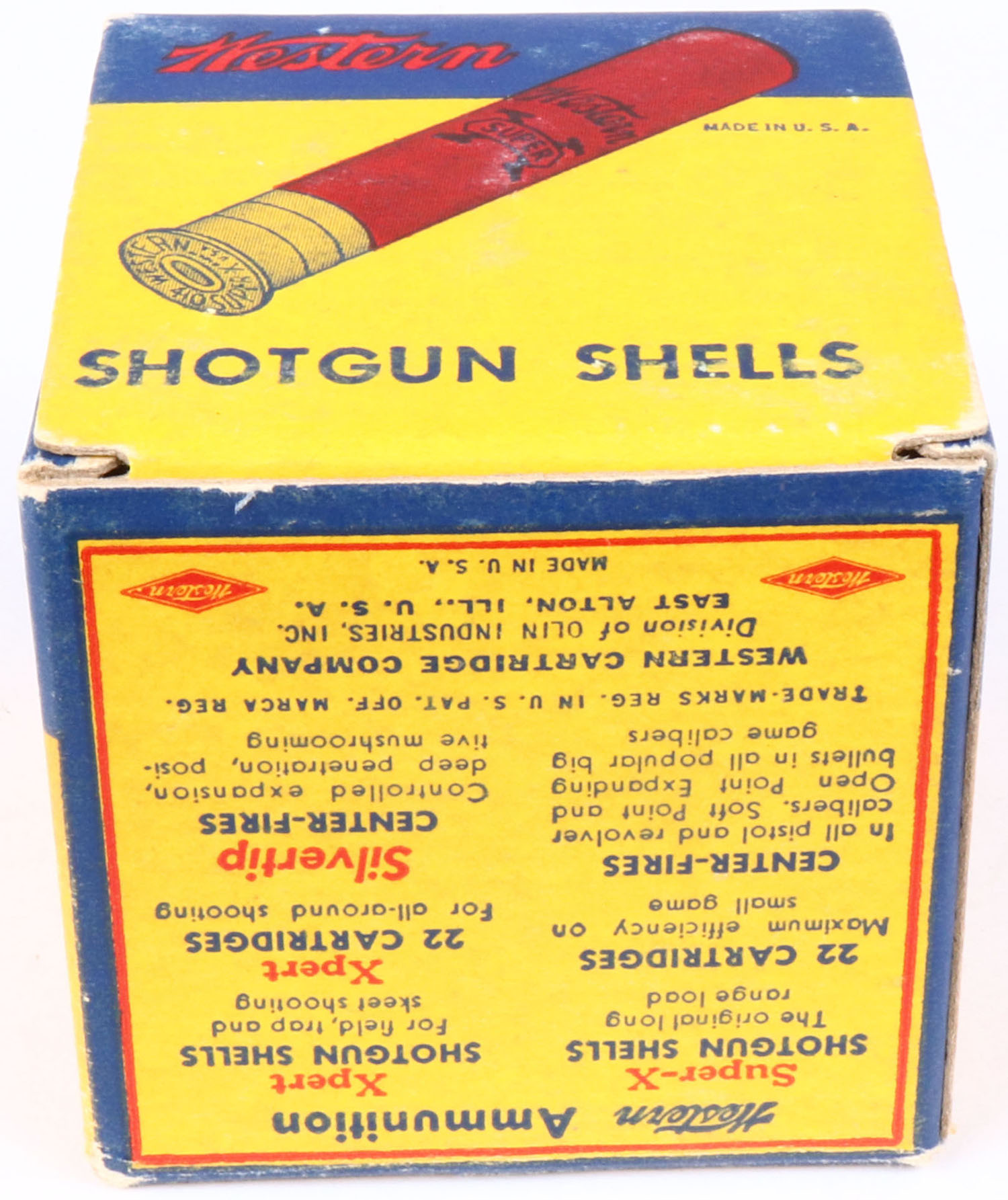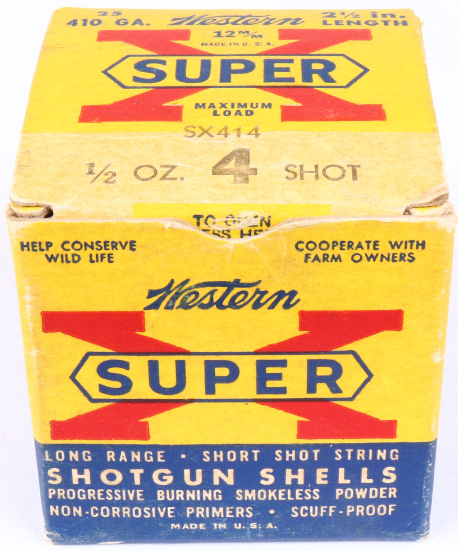 Western, Super X, 410ga., 2 1/2'', 1pc., Full, 4 Shot, multi-colored box, box is very solid with great colors, shells are excellent. Grade: Excellent + - Value: 10 to 30