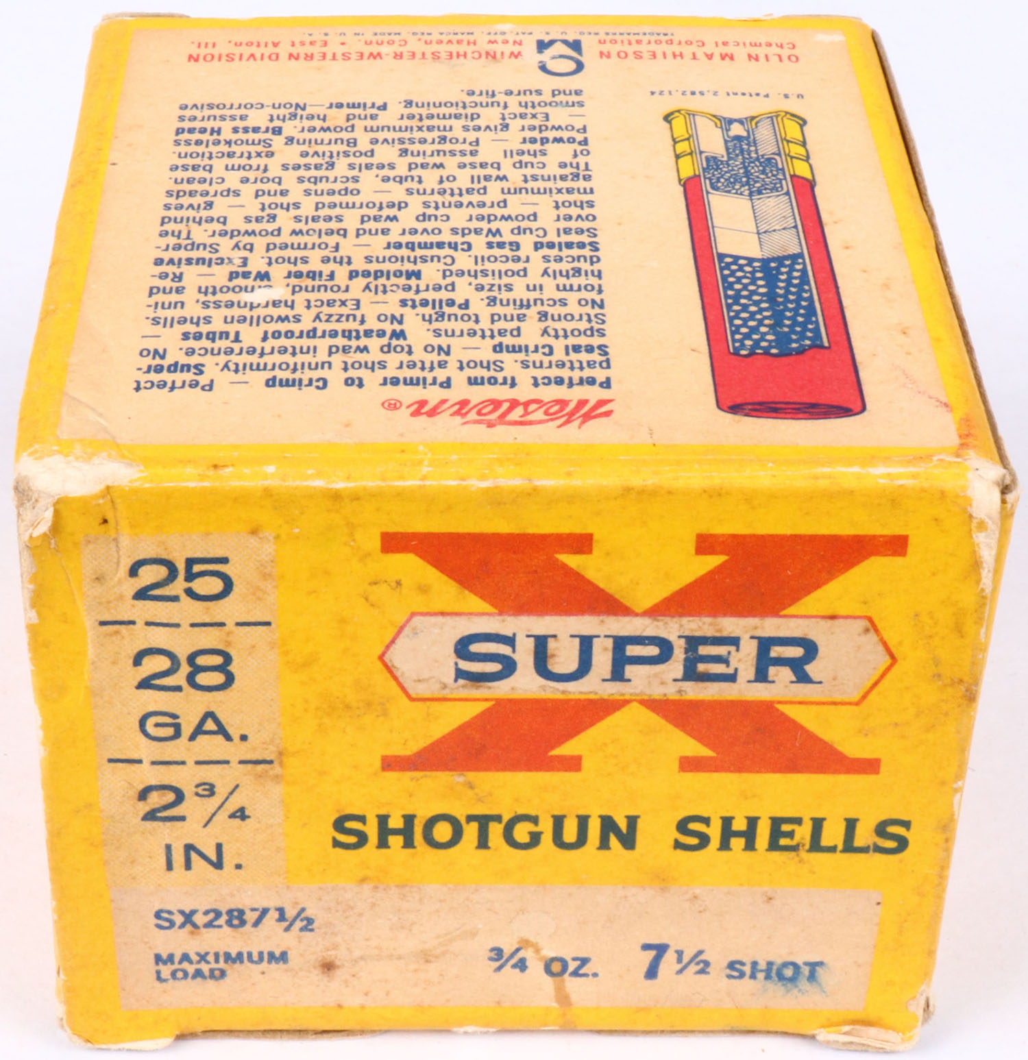 Western, Super X, 28ga., 2 3/4'', 1pc., Full, shot size 7 1/2, multi-colored box, box has age soiling & light scuffing, box is solid with very nice colors, Shells are excellent. Grade: Excellent - Value: 20 to 60