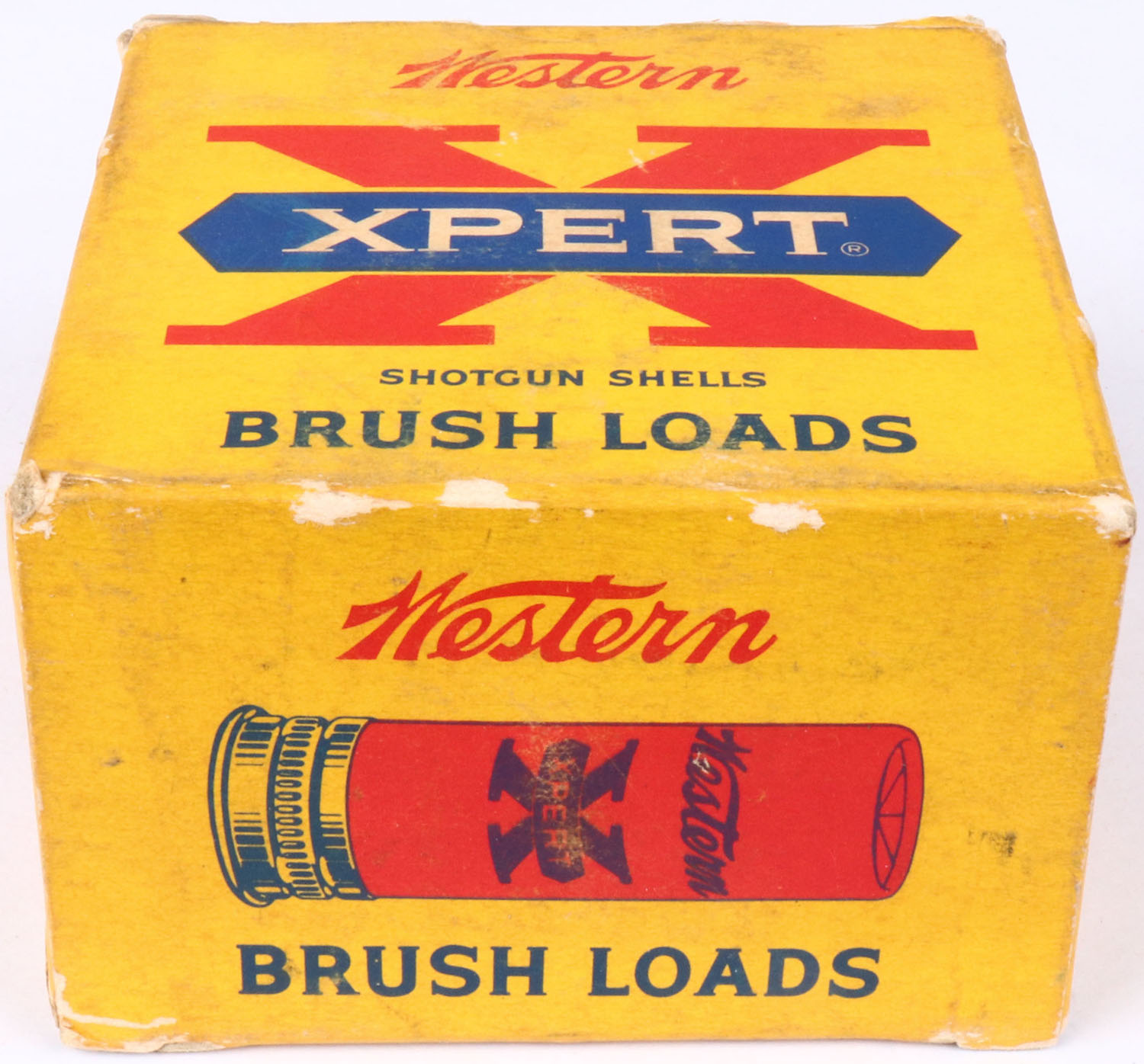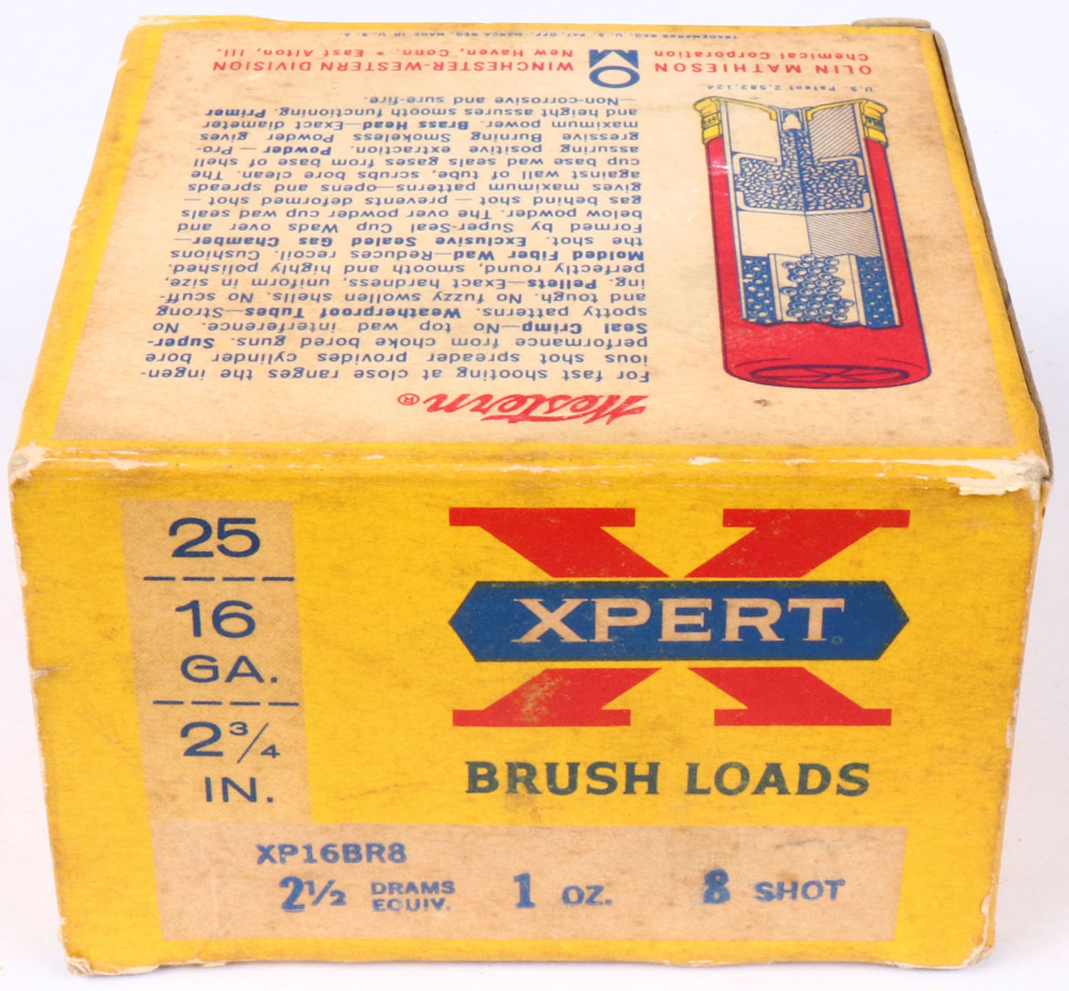 Western, Xpert, 16ga., 2 3/4'', shot size 8 Brush Loads, 1pc., Full, multi-colored box, box is very solid with light age soiling & light edge wear, box has very nice color, shells are excellent. Grade: Excellent - Value: 10 to 30
