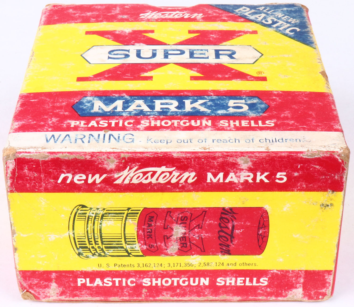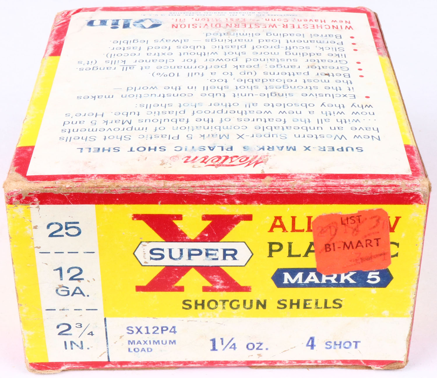 Western, Super-X Mark 5, 12ga., 2 3/4'', 1pc., Full, shot size 4, multi-colored box, box is very solid, shells are excellent. Grade: Excellent - Value: 10 to 30