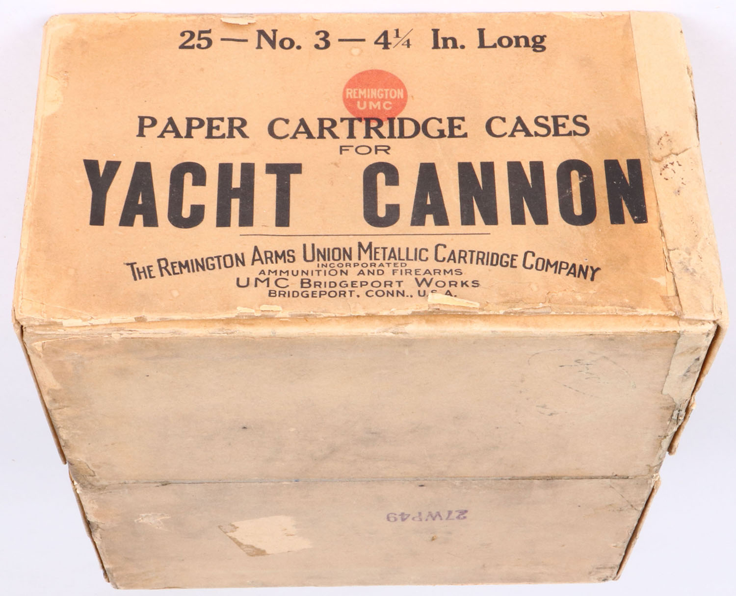 Extremely RARE Remington UMC, YACHT CANNON, 3ga., 2pc., Full, loaded with out shot as they are used for salute cannons or signal cannons, buff box with buff, red & black label, box shows seam spit repairs to inside, label shows some edge wear otherwise very nice, shells are excellent, 4 1/4'' Long. Grade: Excellent - Value: 600 to 1200