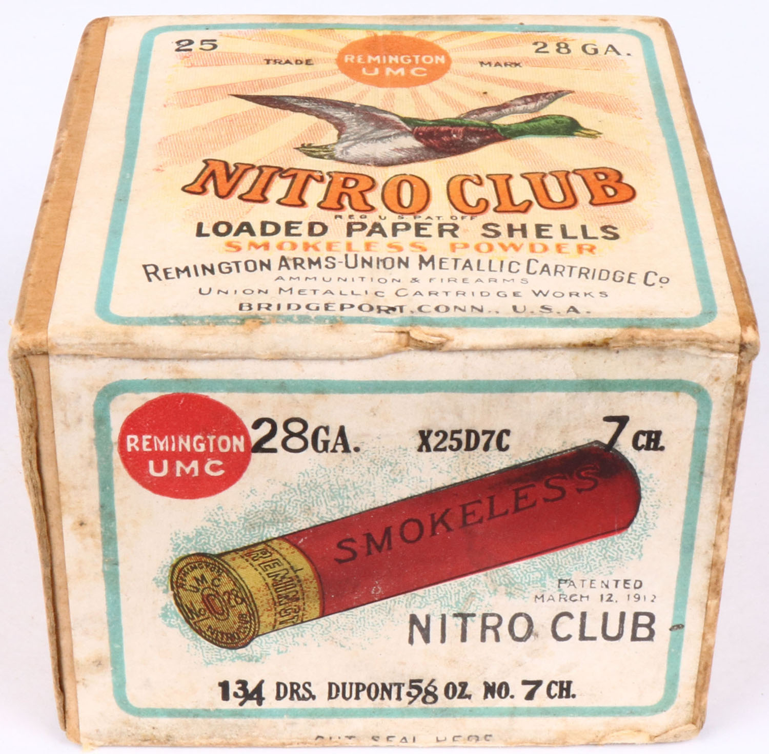 RARE REM U.M.C. Nitro Club, 28 GAUGE, 2pc., FULL & SEALED, shot size 7 CH, buff box with sunburst logo & Mallard flying on top, box is very solid with great label, box has light age soiling, RARE IN 28 GAUGE! Grade: Excellent + - Value: 200 to 800