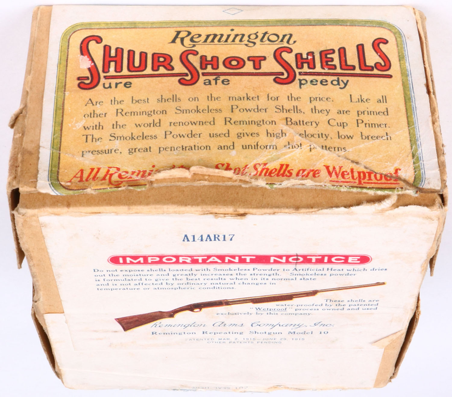 REM UMC, Shur Shot Shells, 12ga., 2pc., Partial 1rd., shot size 5, Buff box with cream & orange paper label, box & label are solid with light age soiling, light edge wear & has very nice color, Shell is very good. Grade: Excellent - Value: 10 to 50