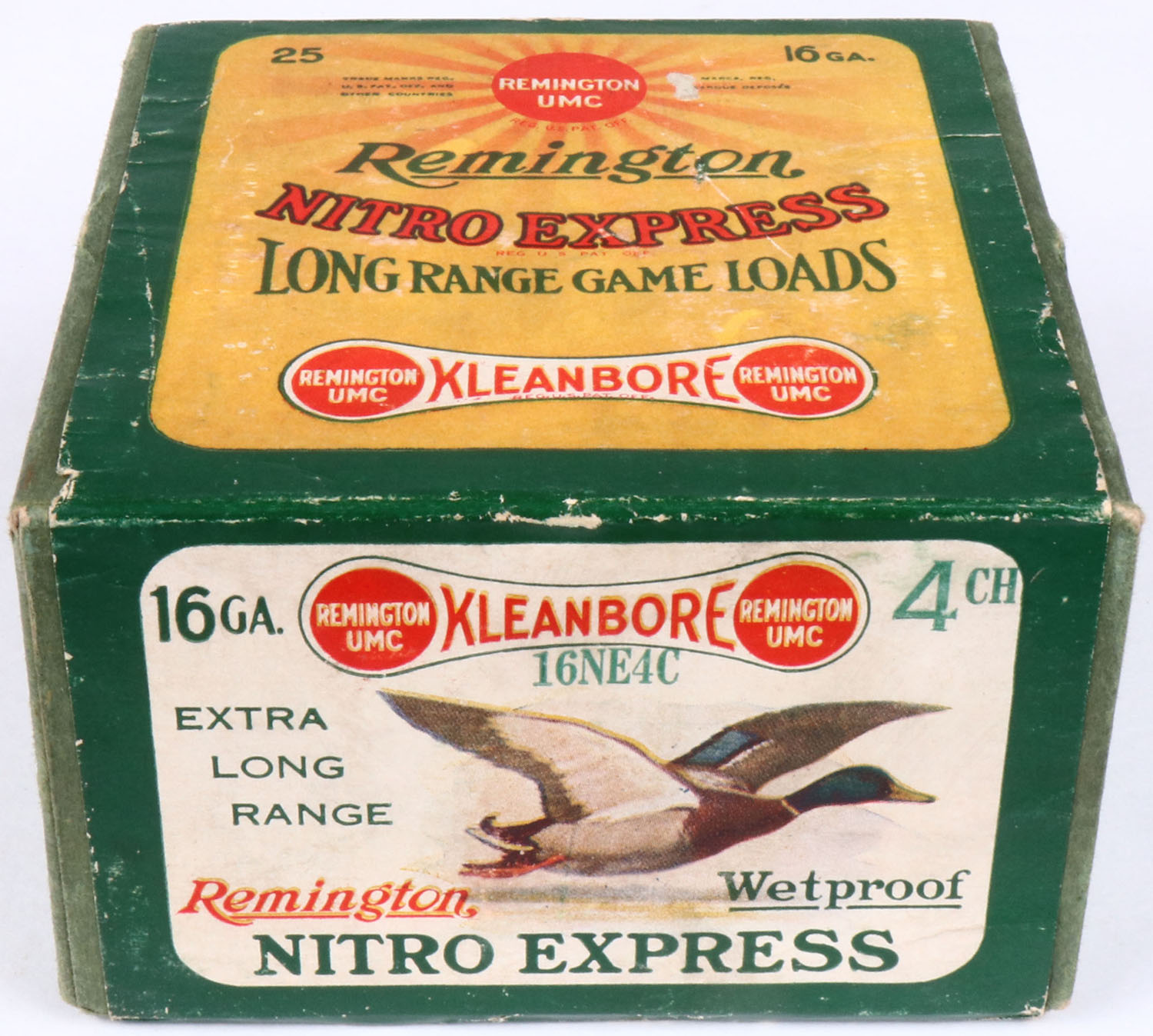 Remington Nitro Express, Long Range Game Loads with Acrylic box, pictures Mallard in flight, 16ga., 2pc., FULL and SEALED, shot size 4 CH, green box with sunburst logo & MALLARD on side, box is very solid with great colors to label. Grade: Excellent + - Value: 80 to 200
