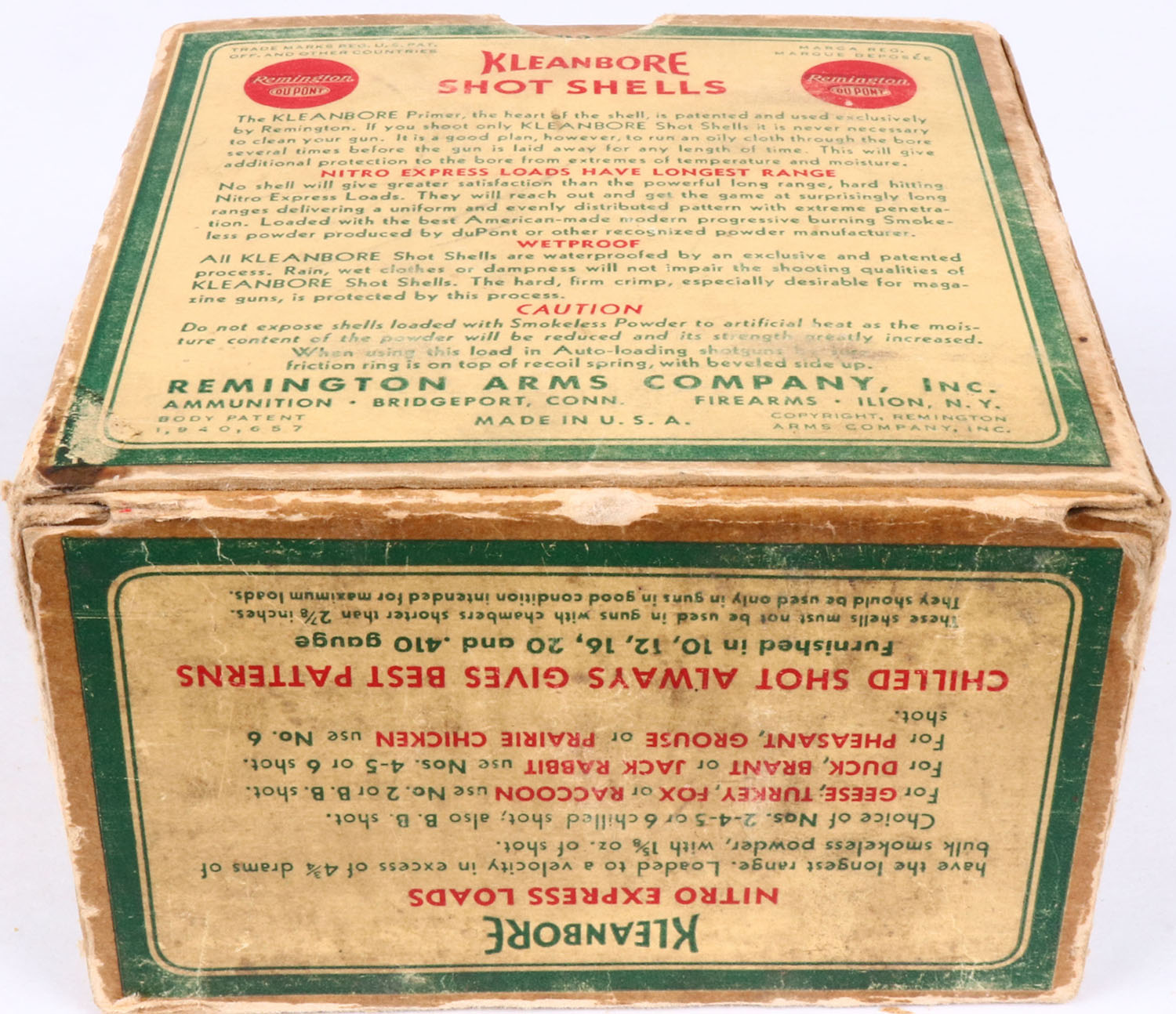 Remington, Kleanbore, NITRO EXPRESS, 10ga., 1pc., Partial 24rds., shot size 4C, box is yellow, red and green, box is solid, has light soiling & light edge wear with very nice colors, shells are excellent. Grade: Excellent - Value: 20 to 80