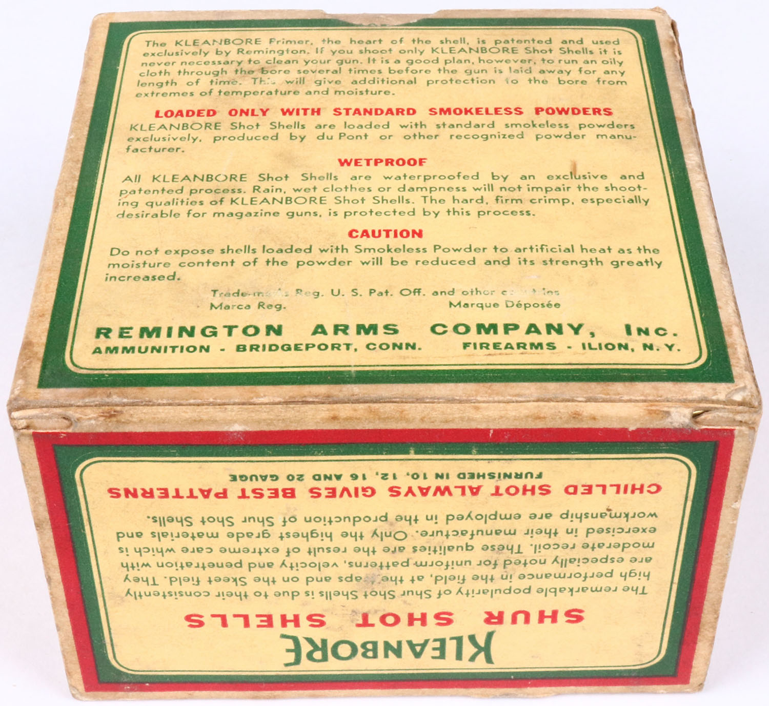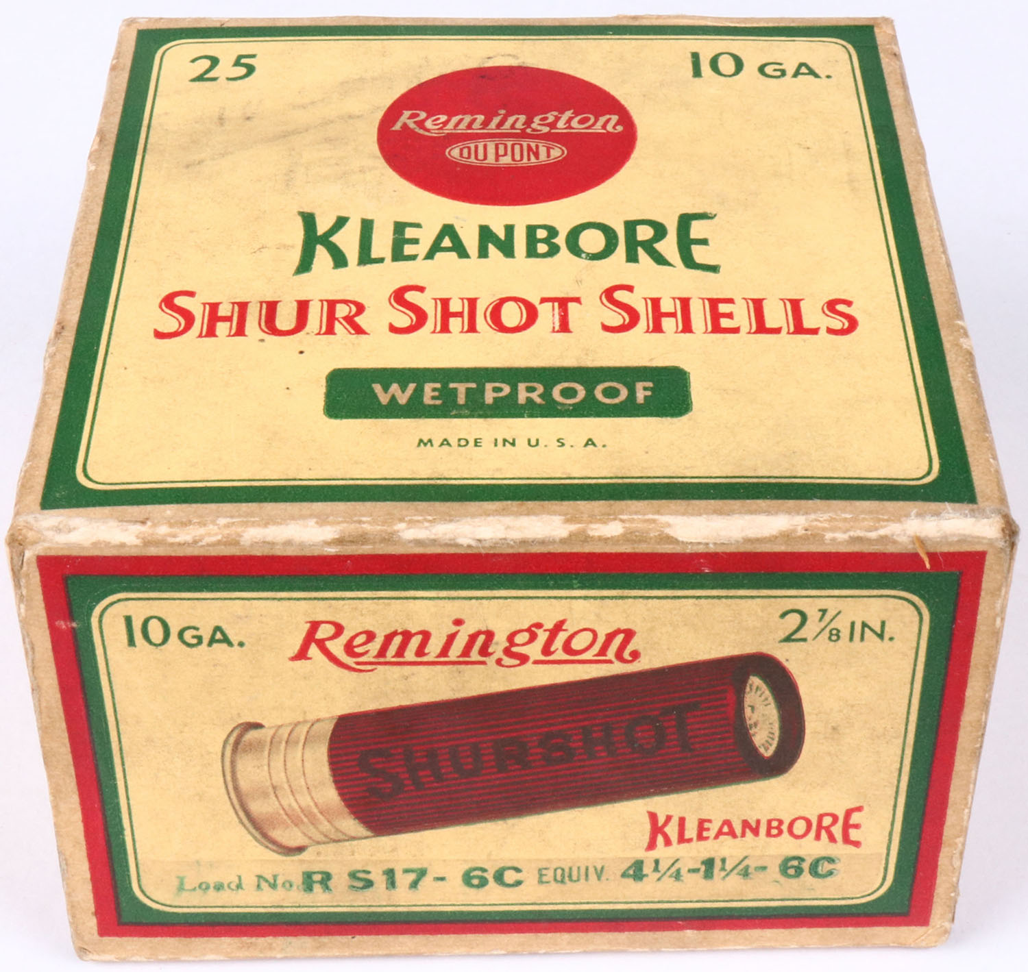 Remington, Kleanbore, SHUR SHOT, 10ga., 1pc., Full, shot size 6C, box is yellow, red and green, box is solid, has light soiling, tape repair to inside flap & light edge wear with very nice colors, shells are excellent. Grade: Excellent - Value: 20 to 80