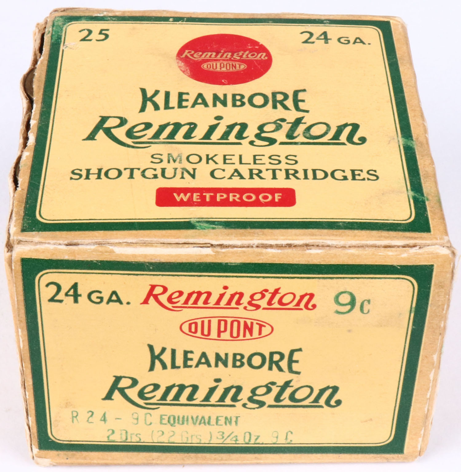 Remington, Kleanbore, 24 GAUGE!!, 1pc., Full, shot size 9C, box is yellow, red and green, box has seam splits, tape repair & light soiling with great colors, shells are excellent. Grade: Excellent - Value: 40 to 150