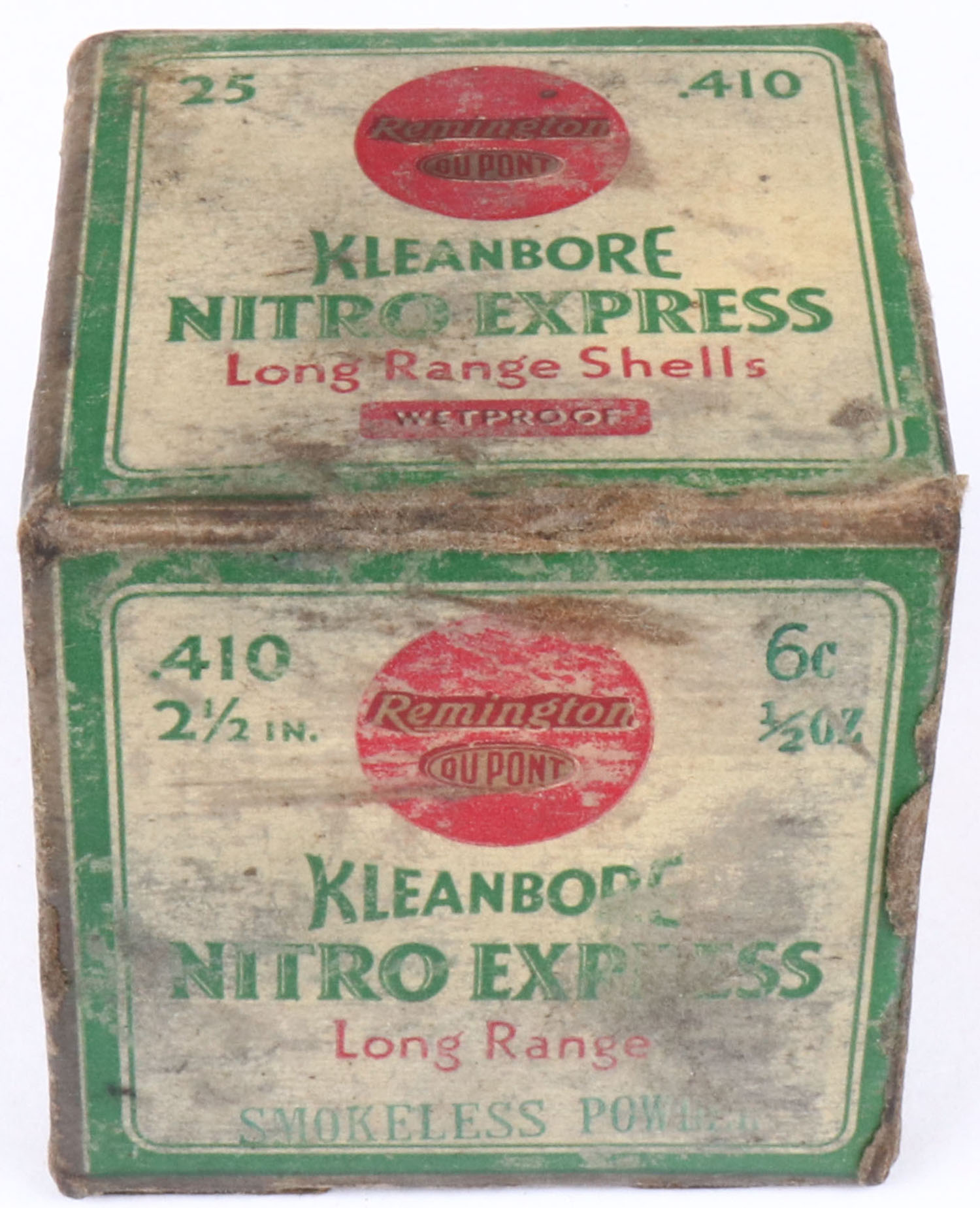 Remington, Kleanbore, NITRO EXPRESS, 410ga., 1pc., Empty, shot size 6C, 2 1/2'', box is yellow, red and green, box is solid, has soiling, edge wear & scuffing with fair colors. Grade: Good ++ - Value: 10 to 30