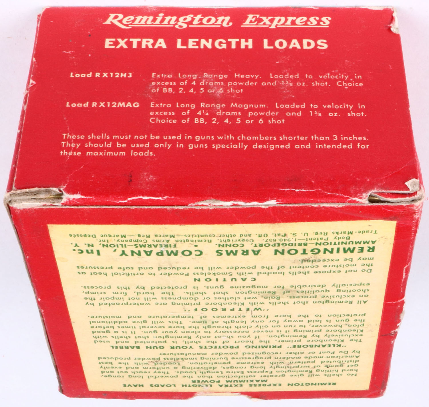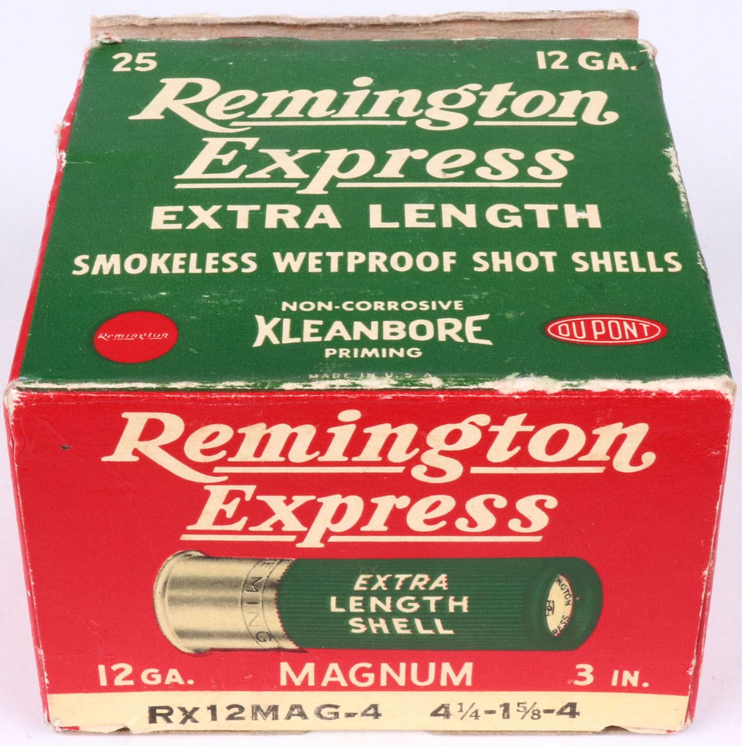 Remington, Kleanbore Express, 12ga., 1pc., Full, shot size 4 Magnum, red, white and green box, 3'', box has edge wear, torn bottom flap & small shell protrusions with great colors, shells are excellent. Grade: Very Good ++ - Value: 10 to 30