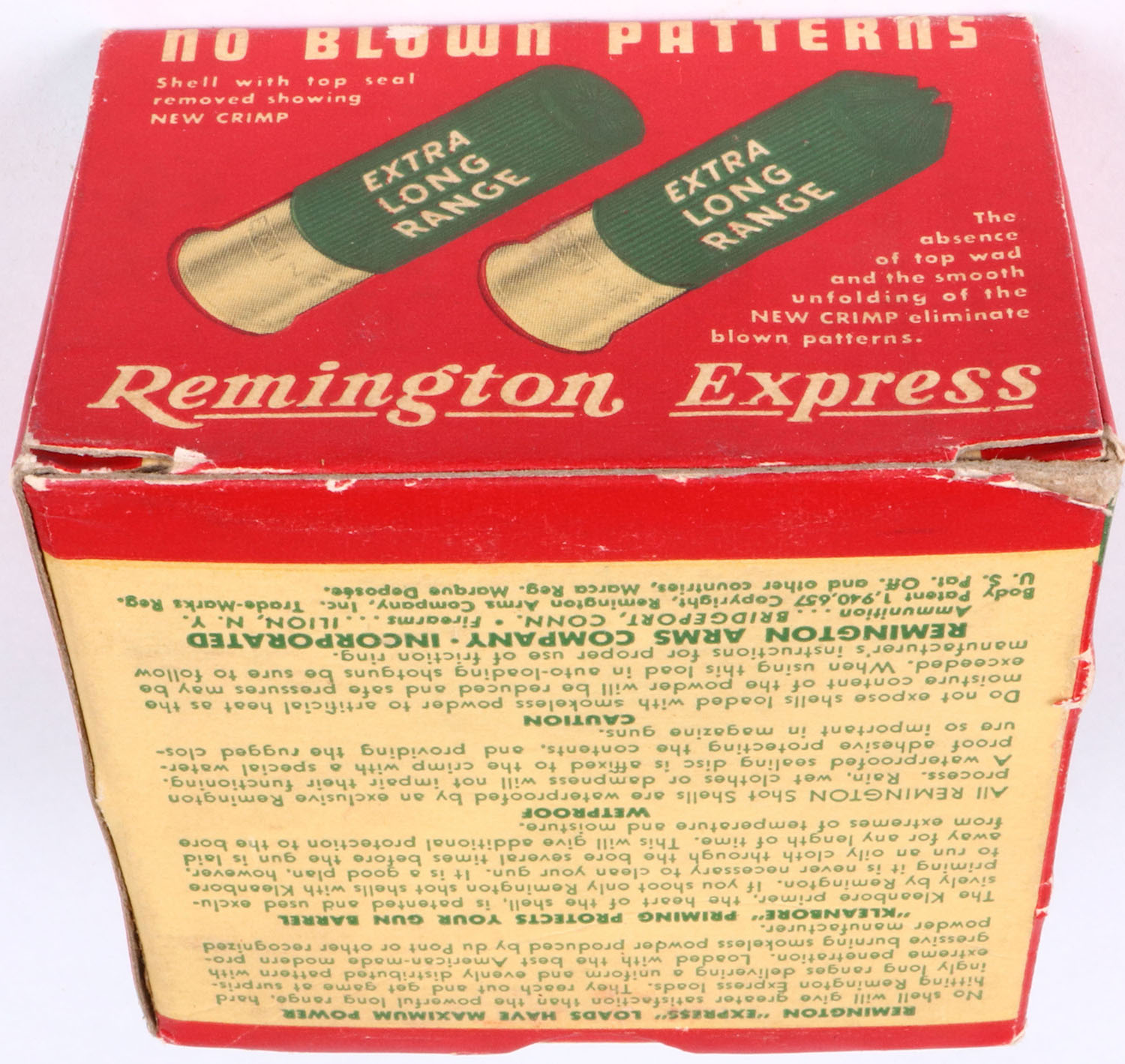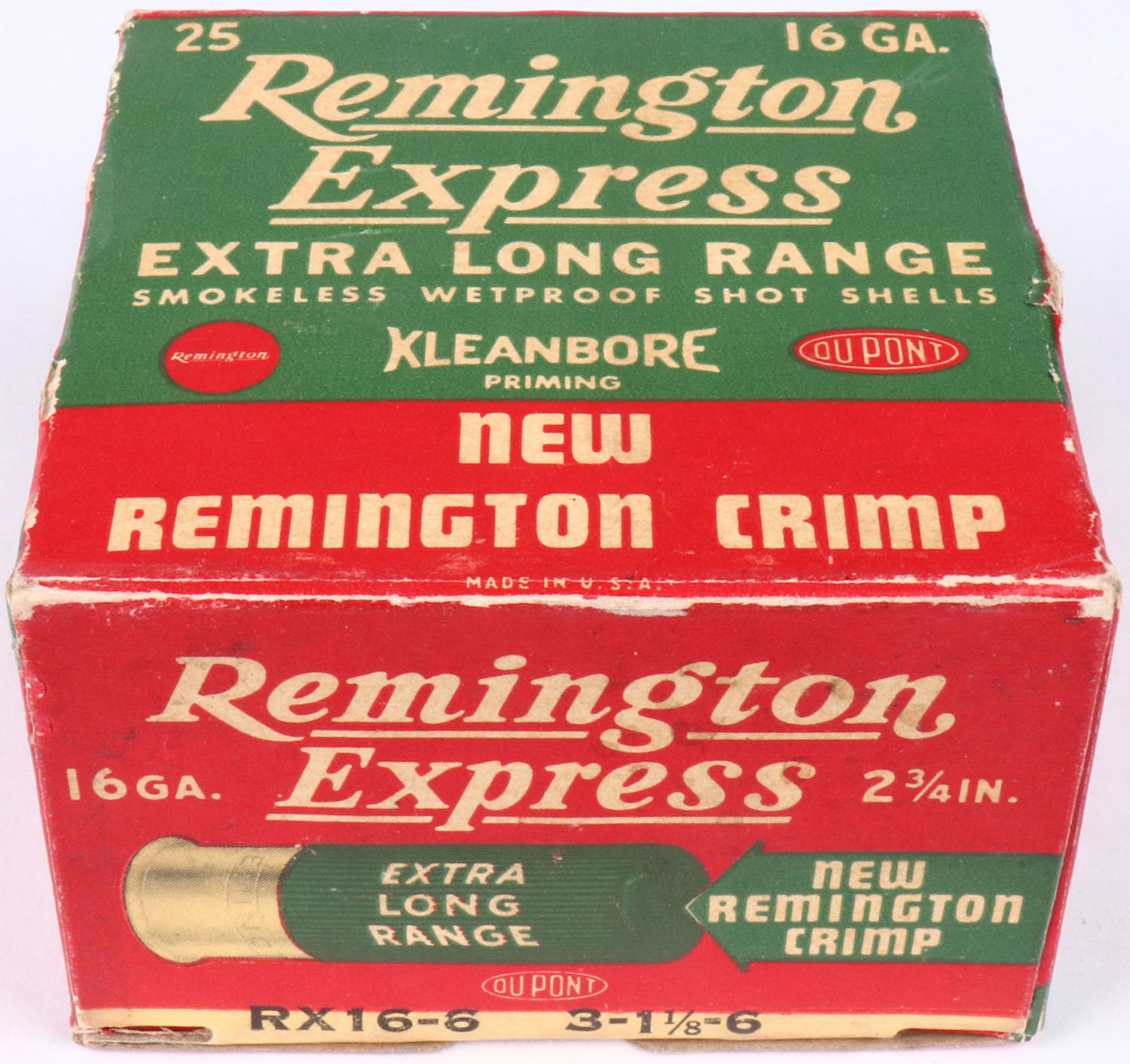 Remington, Express Kleanbore, 16ga., 2 3/4'', 1pc., Full, shot size 6, box is red, white and green, box is solid, box has shell protrusions & light edge wear with great colors, shells are excellent. Grade: Excellent - Value: 10 to 30