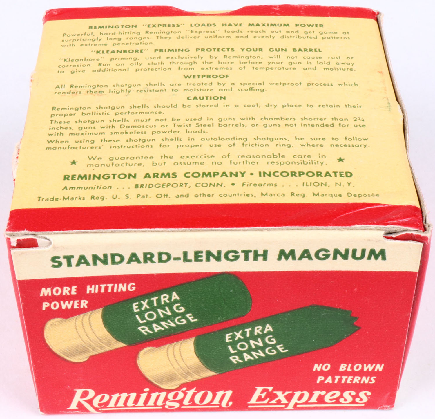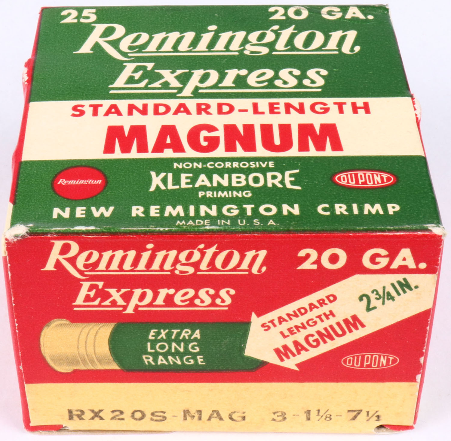 Remington, Express Kleanbore, 20ga., 2 3/4'', 1pc., Full, shot size 7 1/2 Magnum, box is red, white and green, box is solid, box has small shell protrusions with great colors, shells are excellent. Grade: Excellent - Value: 10 to 30
