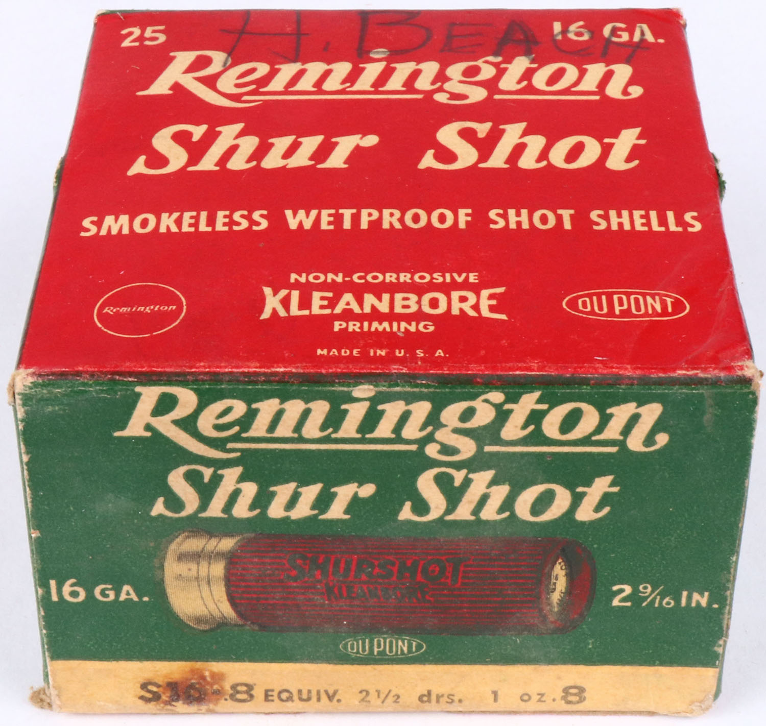 Remington, Shur Shot, 16ga., 2 9/16'', 1pc., Full, shot size 8, box is red, white and green, box is solid, box has light edge wear & light soiling with great colors, shells are excellent. Grade: Excellent - Value: 10 to 30